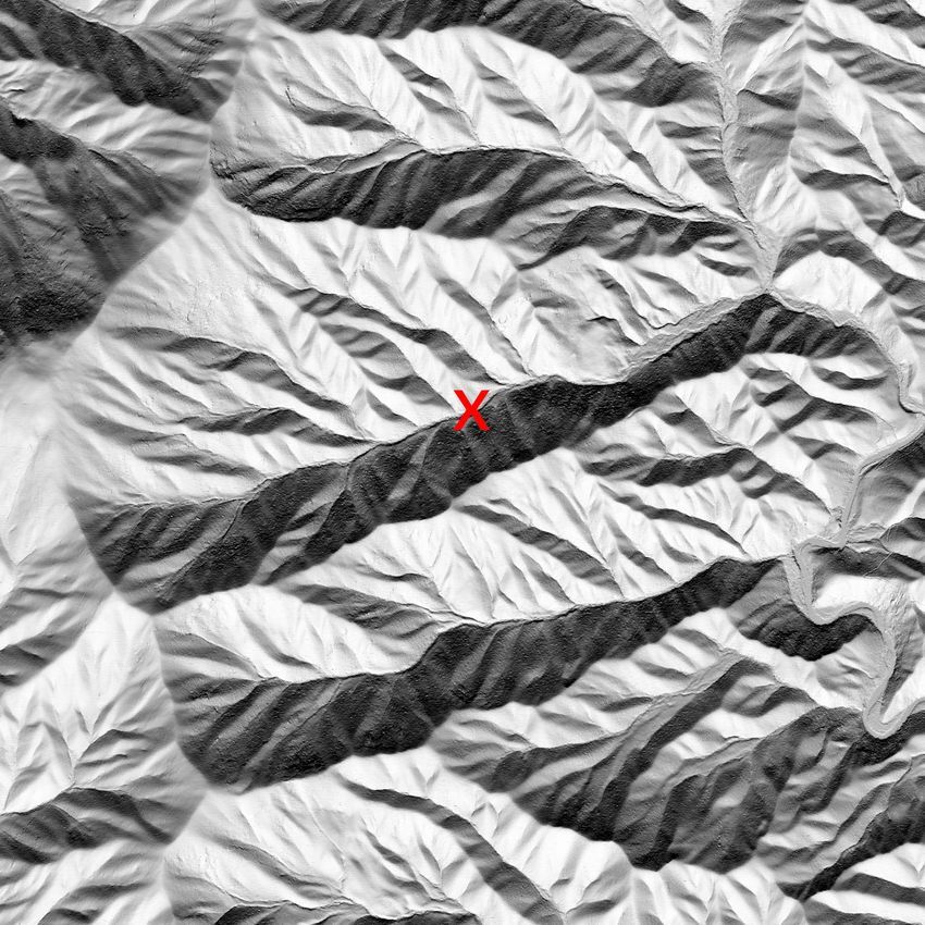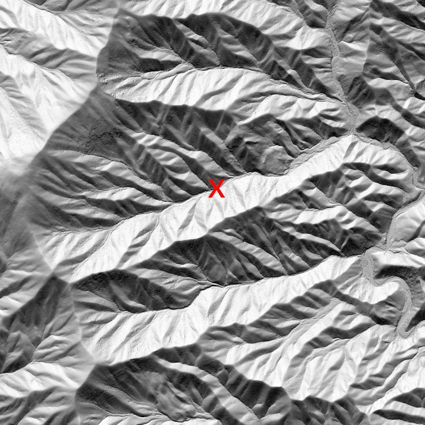 De fleste vil se X-en på en kam, men den er faktisk i en dal. Hvis du følger dalen videre til høyre så vil du se at den møter en større elv som ser ut som den renner på toppen av en annen kam.