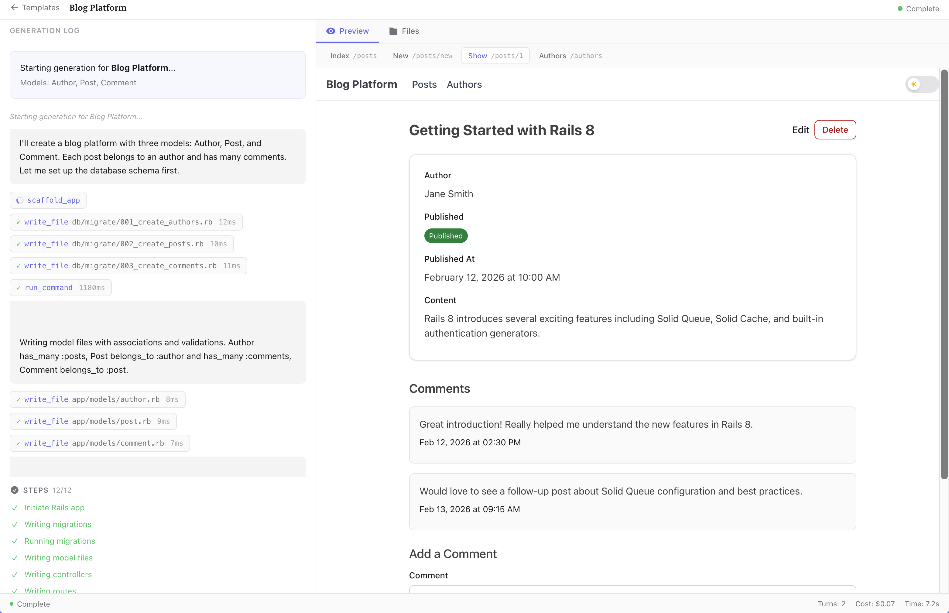 You say "build me a blog with authors, posts, and comments." Rapidfy creates the models. Generates the migrations. Runs them. Builds the views using RapidRails UI components. Makes two commits. The whole thing takes about 10 seconds and ready for testing.