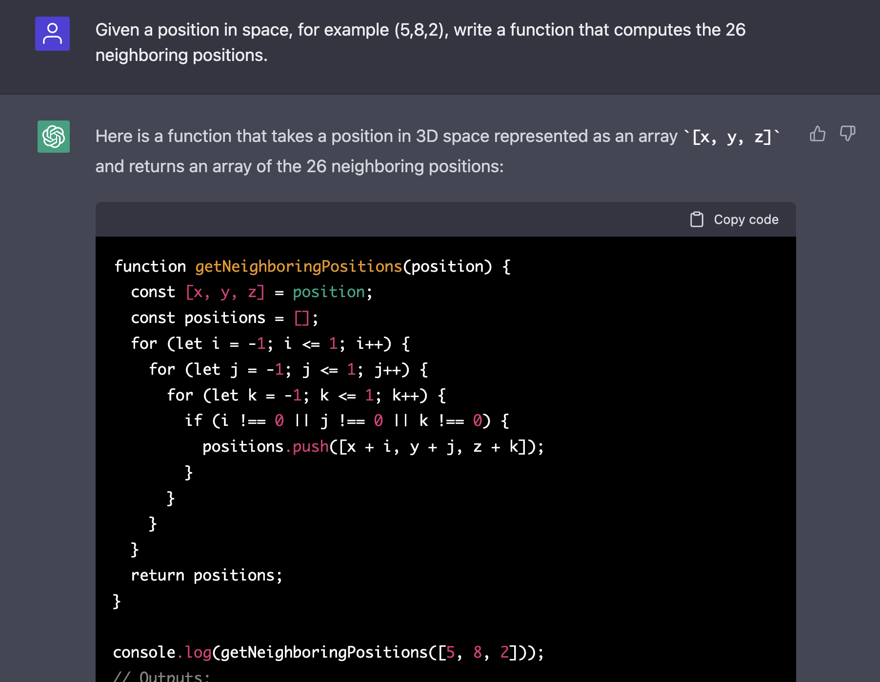 Despite my laziness, I actually wanted to solve the crux of this problem myself for fun. It's all quite simple.. which is kind of the point of Cellular Automata. The following code was written myself, leveraging ChatGPT or Google to gain insight about specific Javascript syntax.