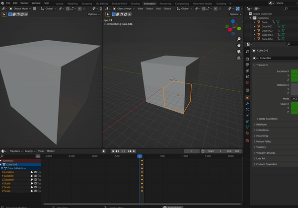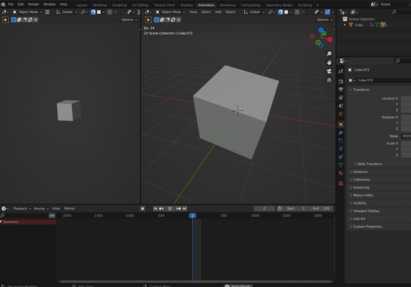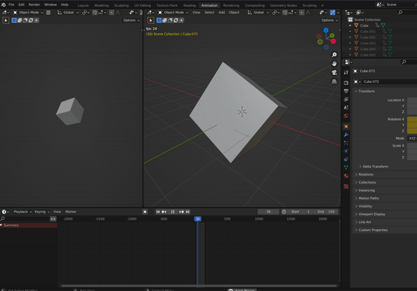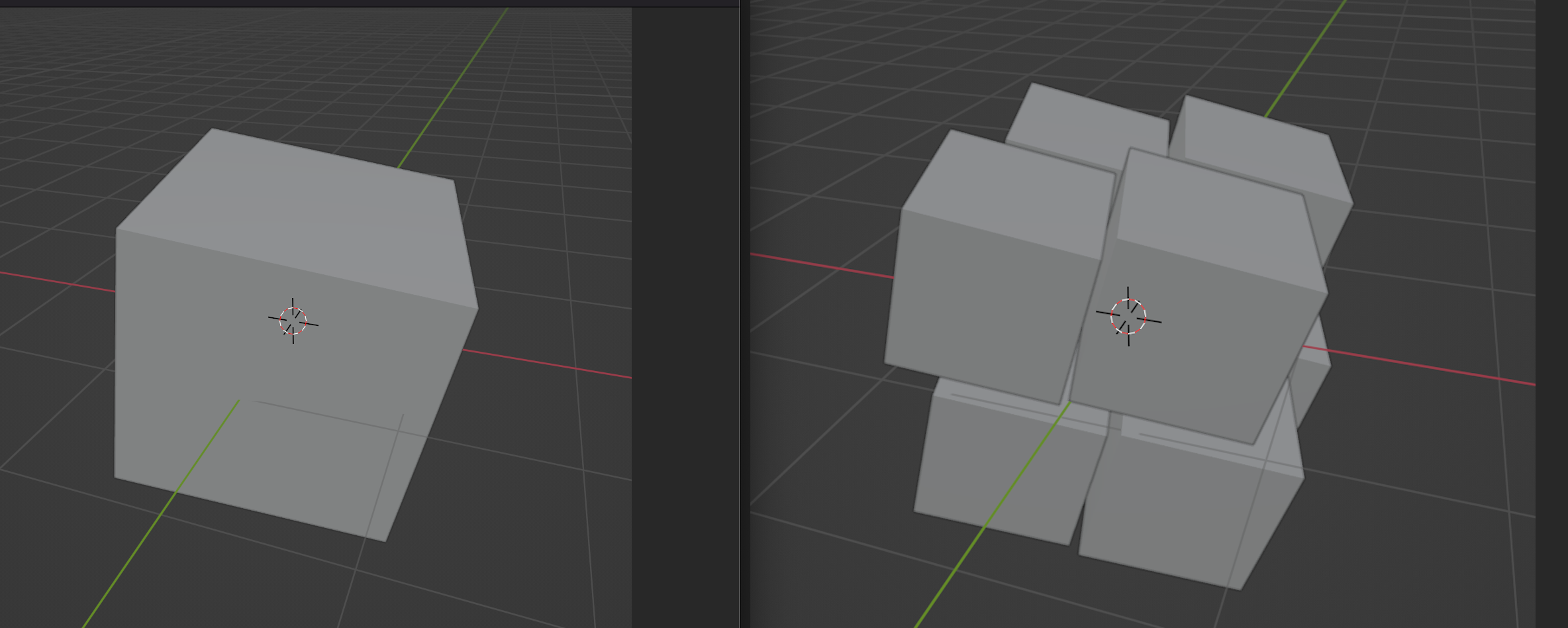 cube.keyframe_insert(data_path="rotation_euler", index=-1)And now... for the for the final act, let's get this recursively splitting into smaller cubes. By this mean, we will start with cube 1 (seen spinning above), this will be called the "original cube". Recursively, cube 1 will become constructed of 8 cubes (with some spacing between them), 8 cubes will be come 64, 64 will become 4096, and so on. Some time will pass between these splitting events.