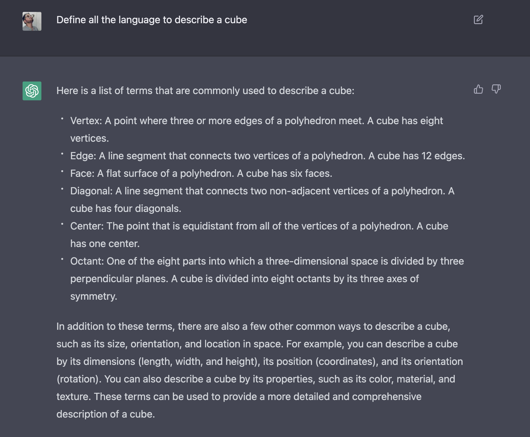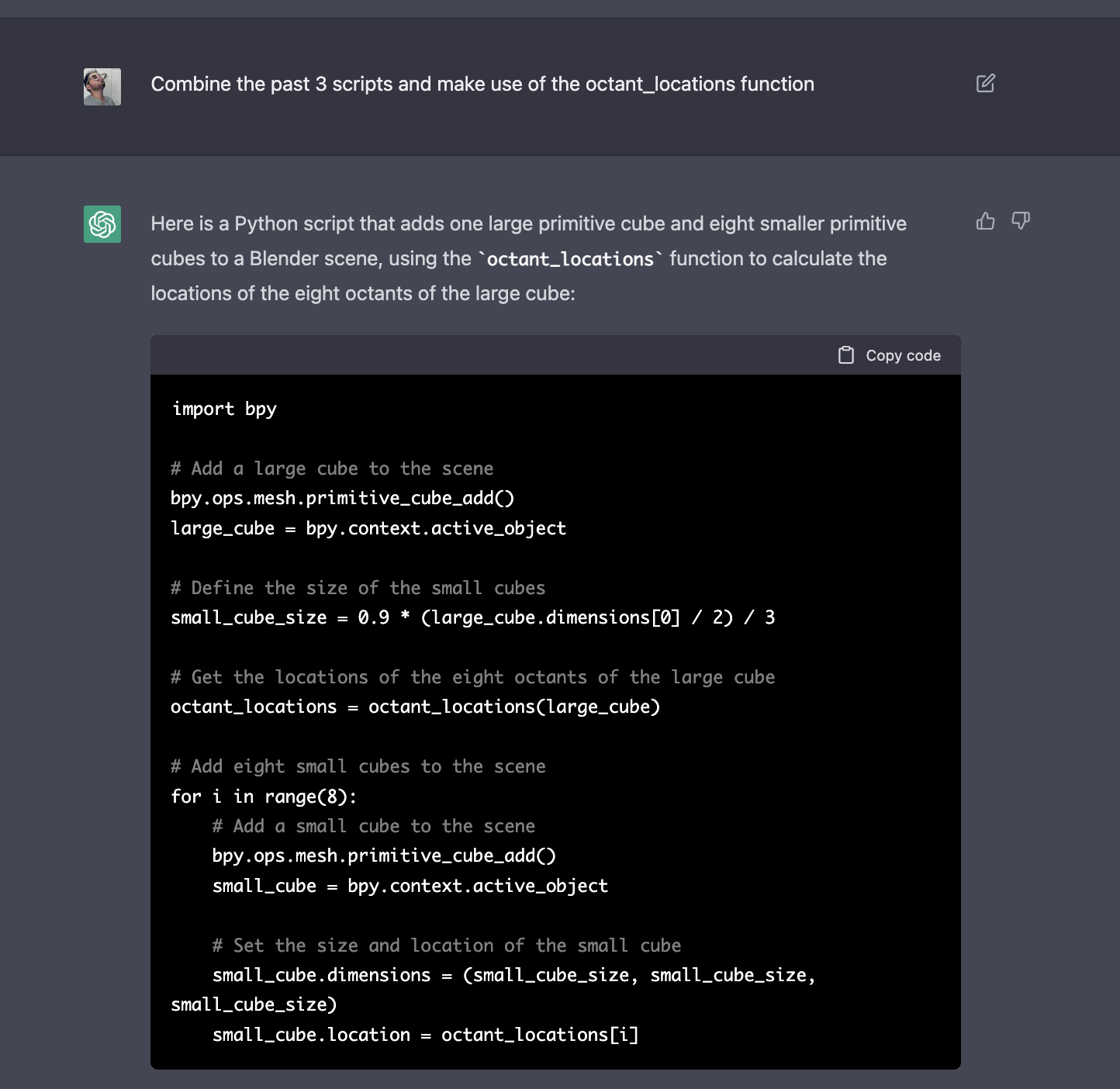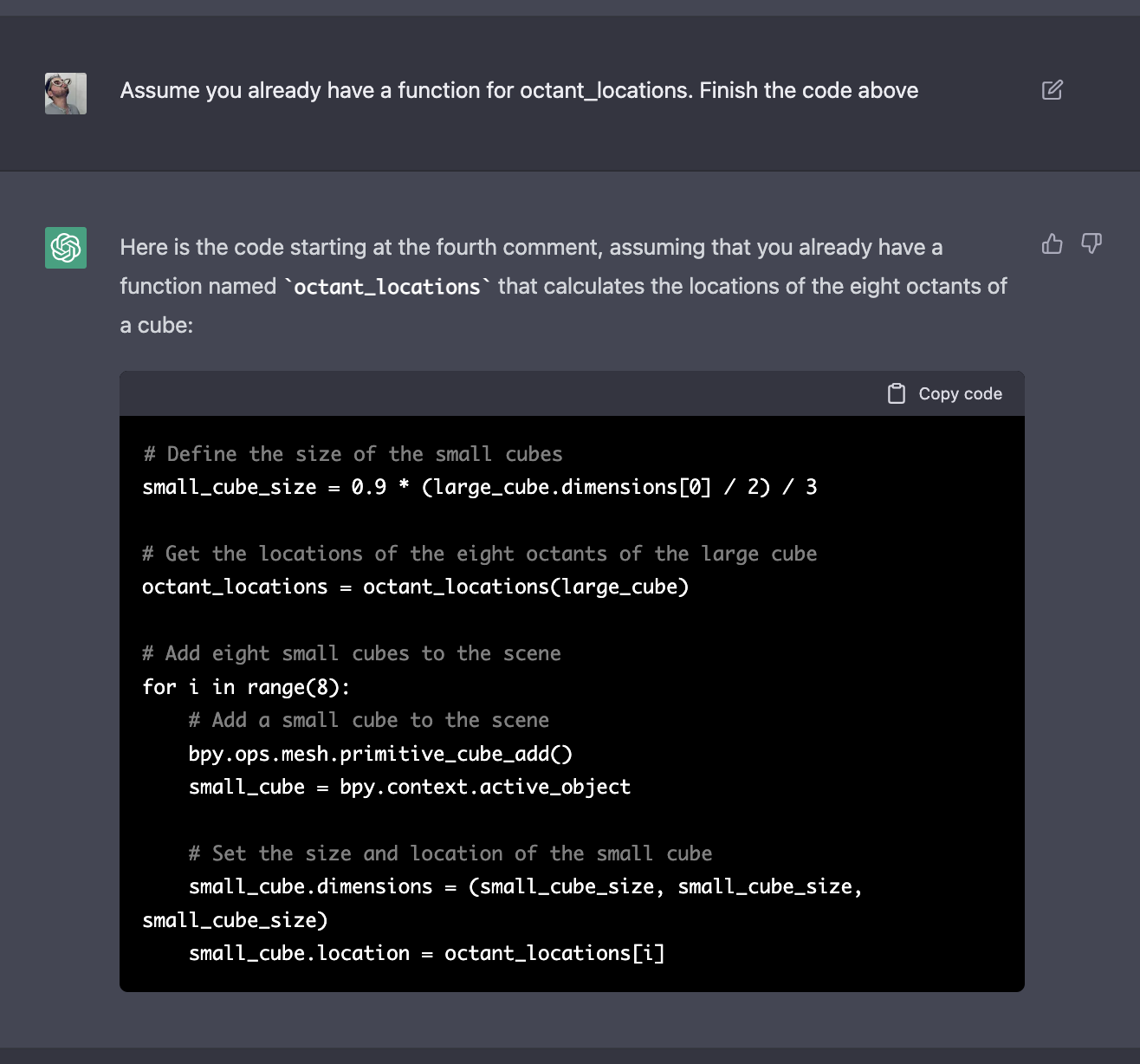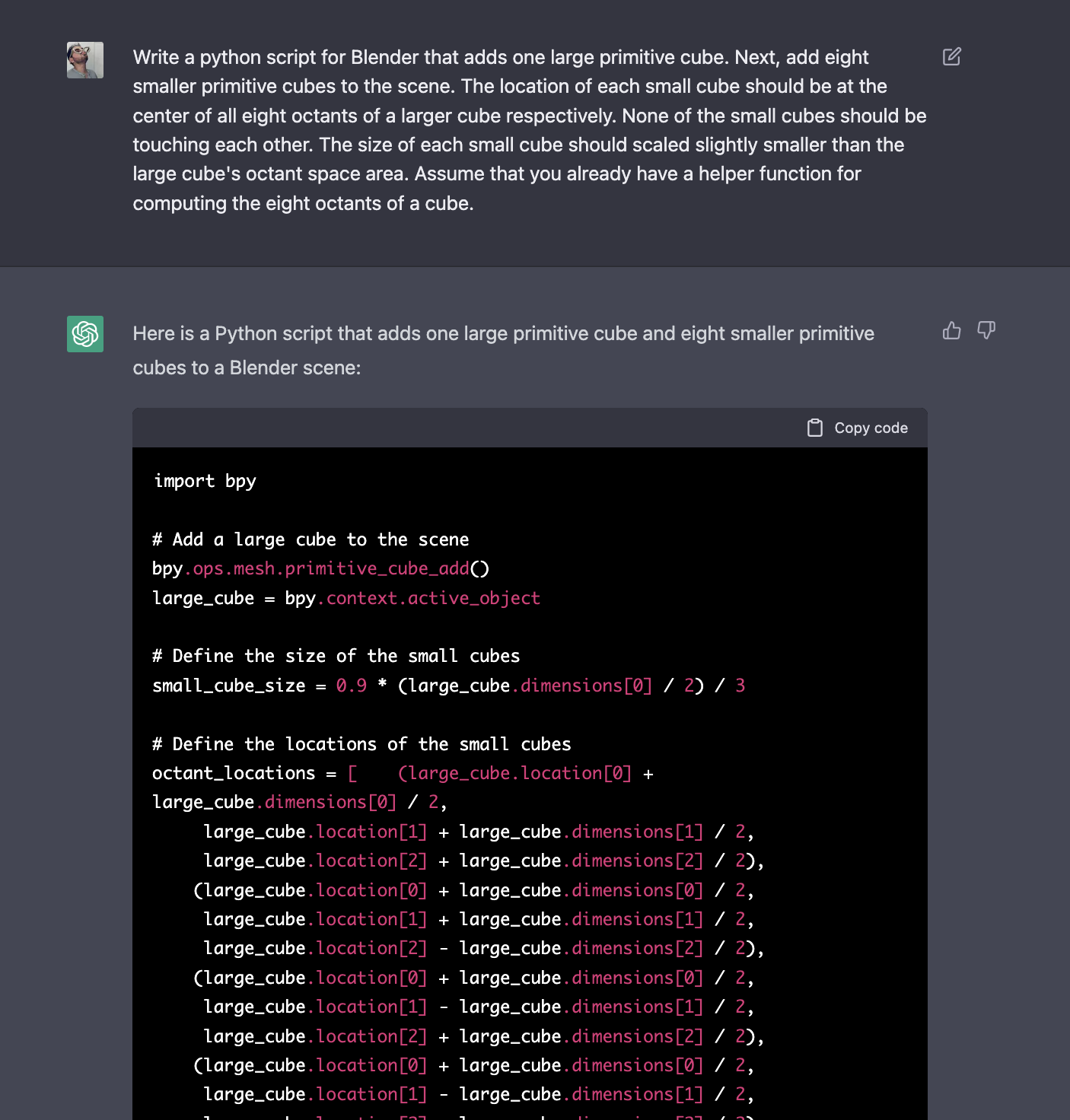 Third, ChatGPT is great for the boiler plate work of constructing generic algorithms and teaching me relevant APIs functions. This is a HUGE time safer. For example, computing the octants of a cube is trivial, it just requires boring brain power and a lot of typing and formatting. ChatGPT did this in seconds.