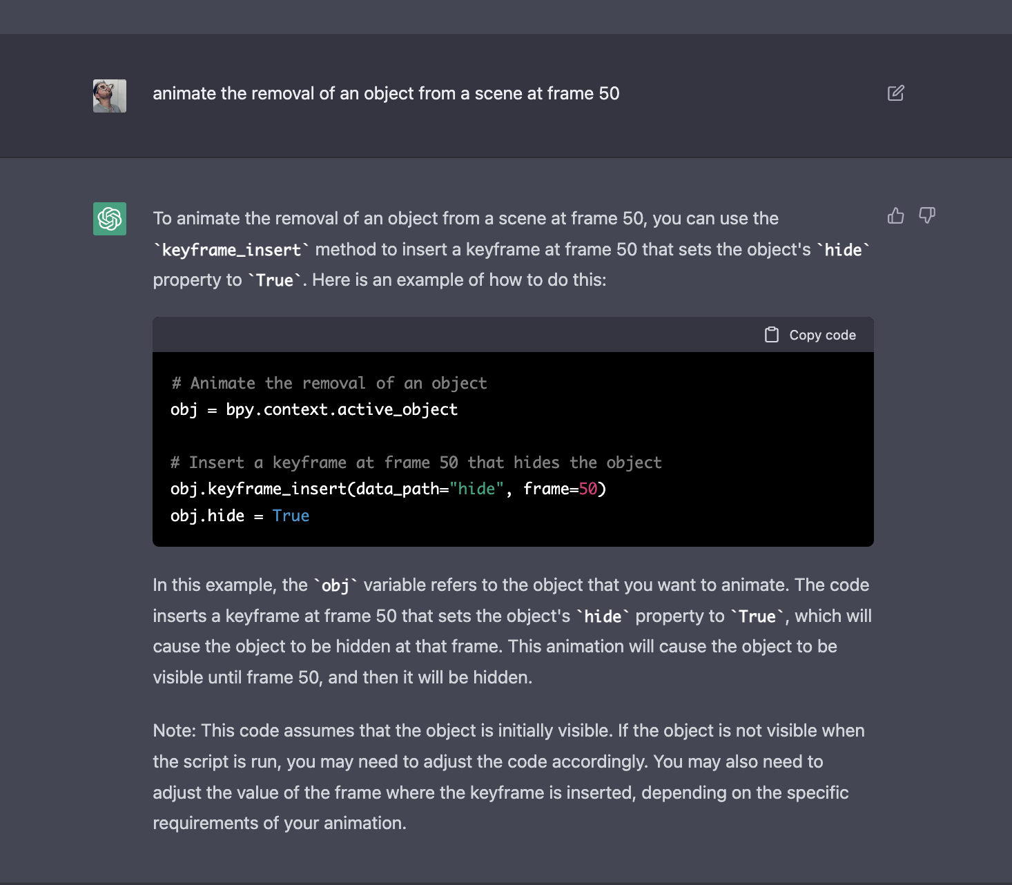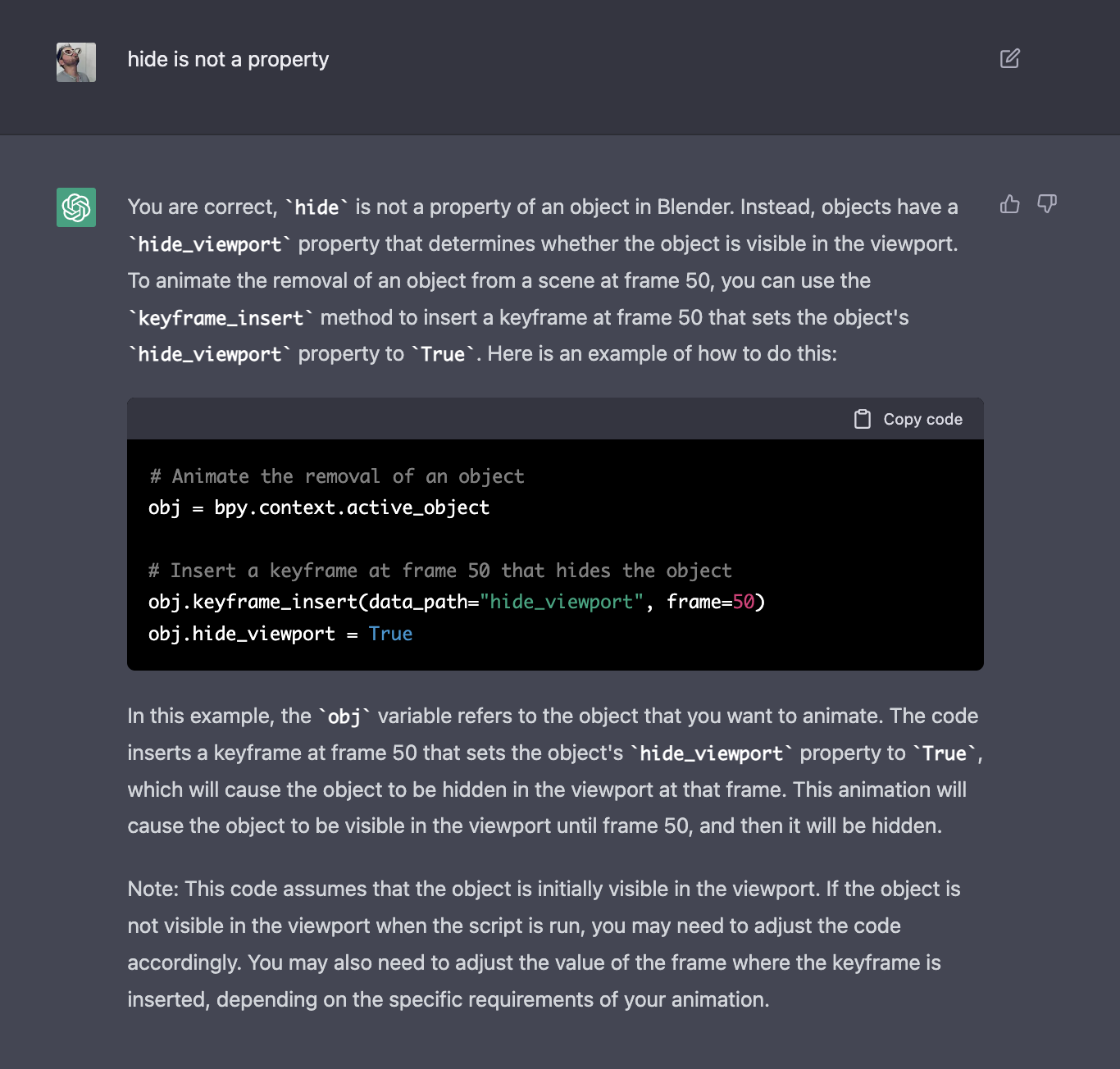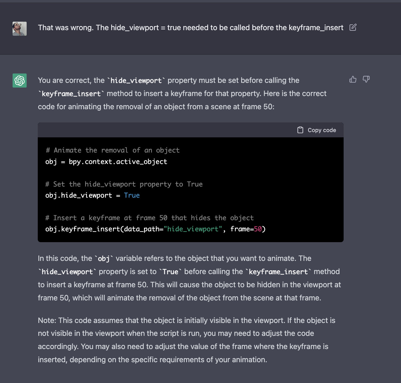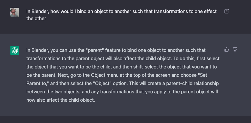 Second, Googling and direct source documentation was better use of my time for problems that encompassed potentially outdated solutions. Applications and software are constantly changing - functions get deprecated, names change, views move... ChatGPT's documentation states that it only knowledgable about the world up until 2021, so any updates to Blender from 2021 to the time of writing this may potentially be stale, and I encountered a few instances where ChatGPT sent me off track because of this.