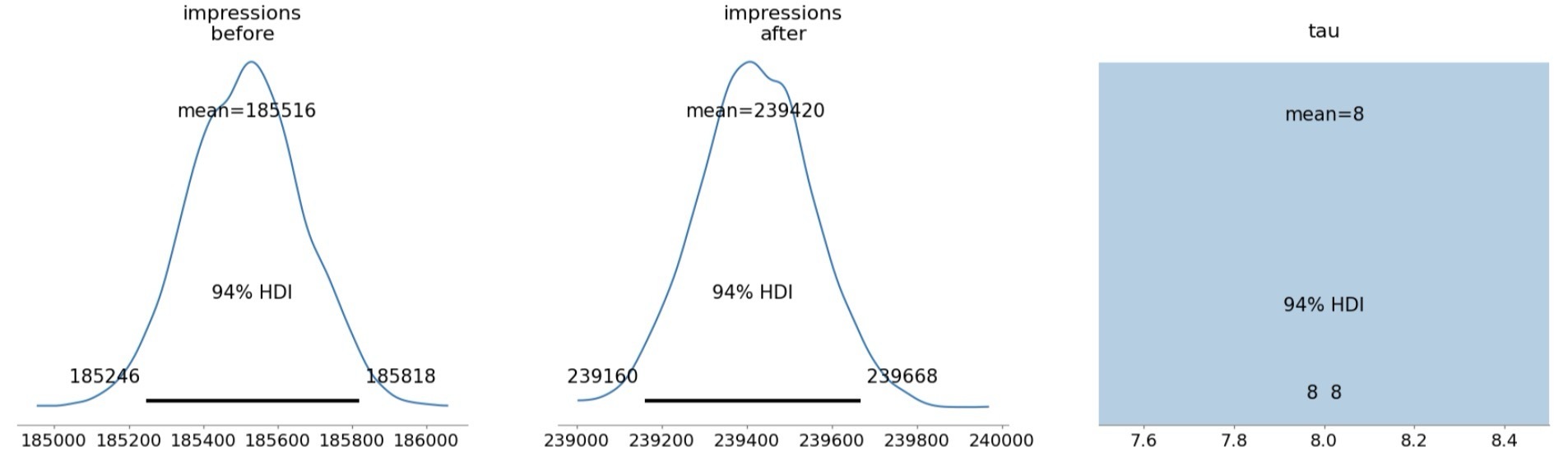 In my case, the model detected a razor-sharp switch point on day 8 with 99.9% posterior probability. Impressions jumped from a pre-switch mean of 185,516 (94% HDI [185,246 – 185,818]) to a post-switch mean of 239,420 (94% HDI [239,160 – 239,668]) — a statistically significant +29% surge in volume, with zero overlap between the two posterior distributions.
