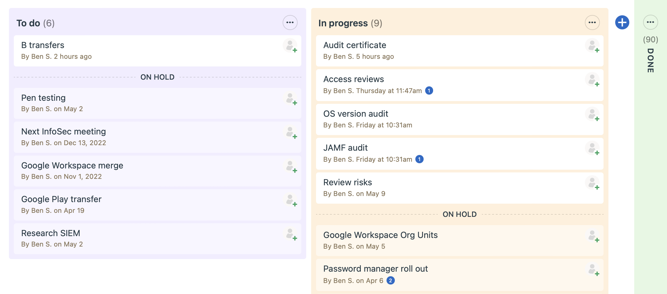 For the last few months, I've switched to a kanban-style task list instead of a top-to-bottom list, which helps me keep track of the status of the items I'm working on. I have a 'To do' column, one for 'In progress,' and a third for 'Done.'
