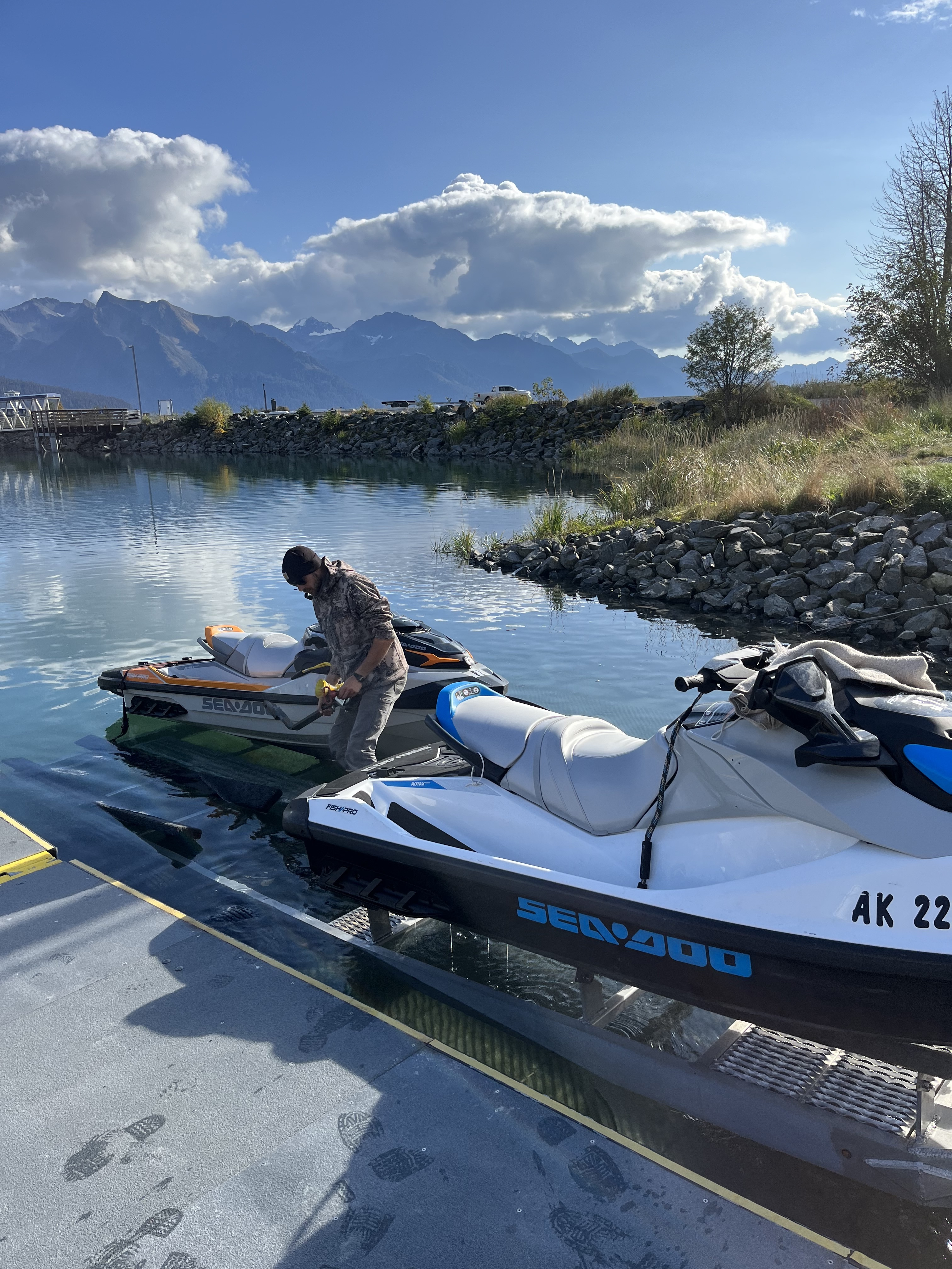 Alaska is a somewhat fickle place for surf as the tidal range is pretty large - about a 10 - 12' difference in height between low and high. The break we were targeting only worked around low tide so we had to schedule around that. The first good looking day low tide was at about 4:30pm, which was a bit late in the day but still very doable. Jake just wrapped up his last tour guiding for his business, Jet Ski Seward Adventures.