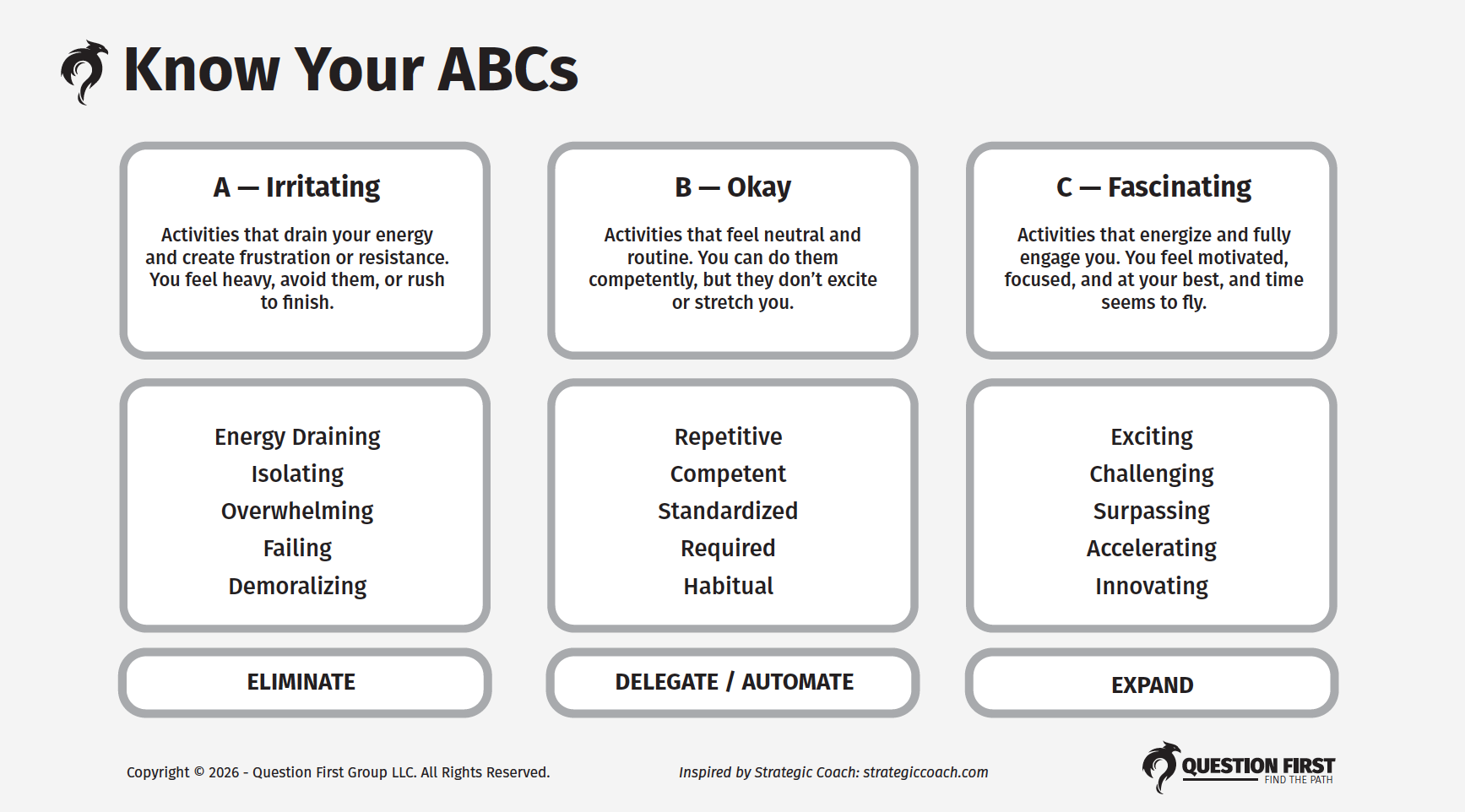 The goal of the framework is this: eliminate your A's, delegate your B's, and expand your C's.