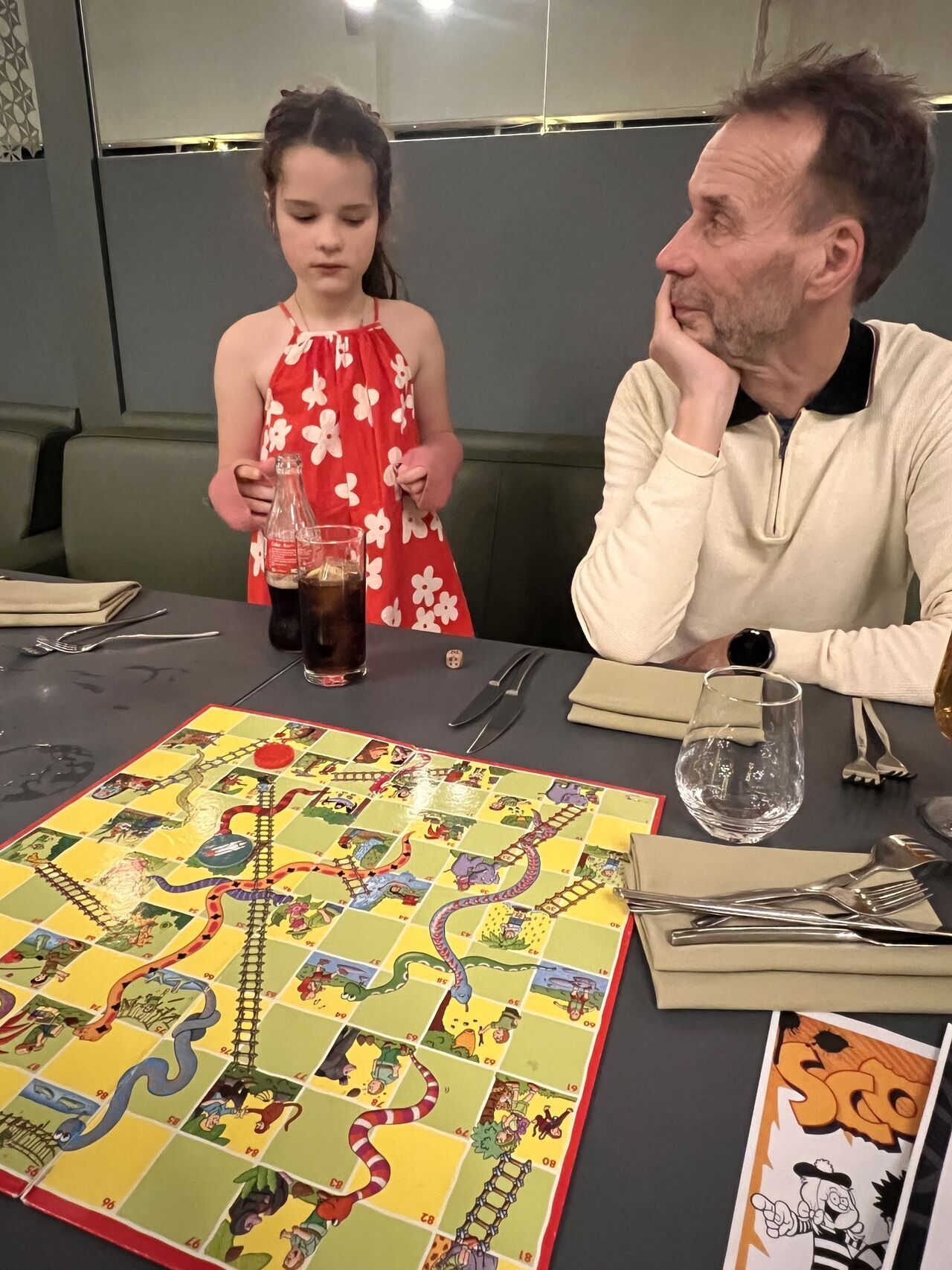 First, a young waiter brought our drinks to the table. As they set them down, one of the bottles toppled and lemonade went everywhere — all over the table, all over the game of chutes and ladders Luna and I were playing.