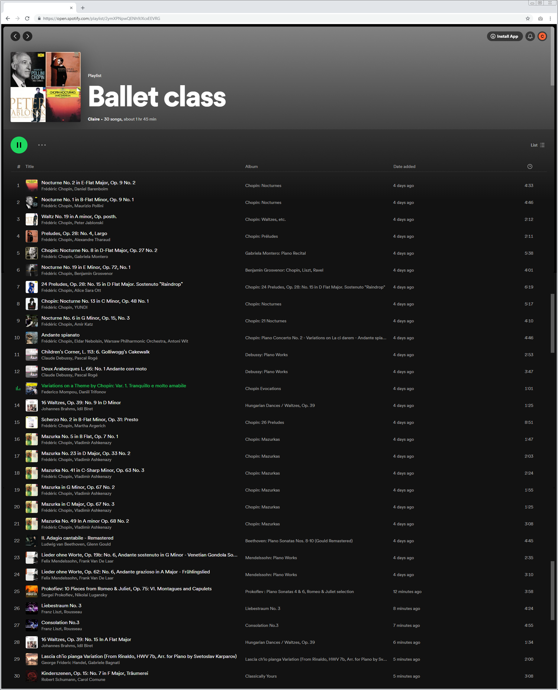 The above playlist are 30 songs I heard almost every afternoon for most of my teenage years—from Chopin, Debussy, Brahms, Beethoven, Mendelssohn, Prokofiev, Liszt, Handel, Schumann. A little time capsule for me, maybe useful if anyone needs a playlist of time-tested ballet class accompaniment music, specifically classical pops.