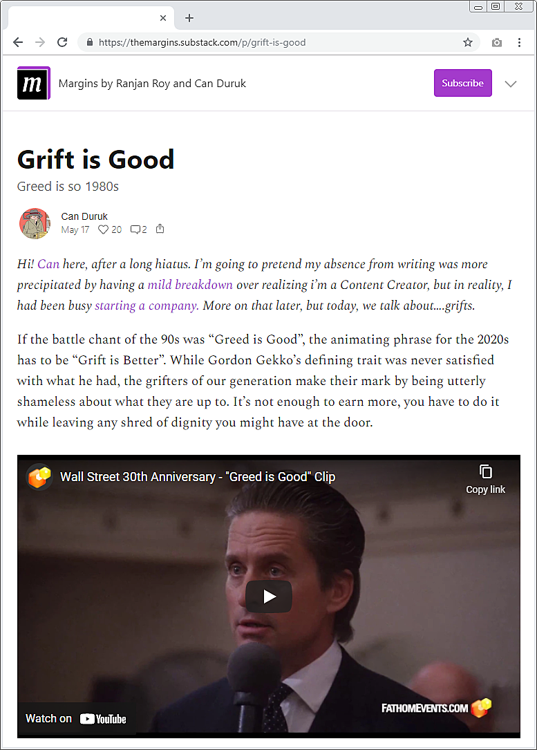 Grift exemplifies whatever dystopian phase of capitalism we're currently in. In our absolutely insane world of play money and megalomaniacal electric car company founders, there are no referees or rules, and thanks to social media platforms, success is measured and rewarded handsomely by the internet noise equivalent of a clap-o-meter. Can Duruk runs through the hall of fame of current technology-enabled grifts and puts it all so much better than I could have ever articulated myself, but I don't come to the same conclusion that one should start embodying grift...