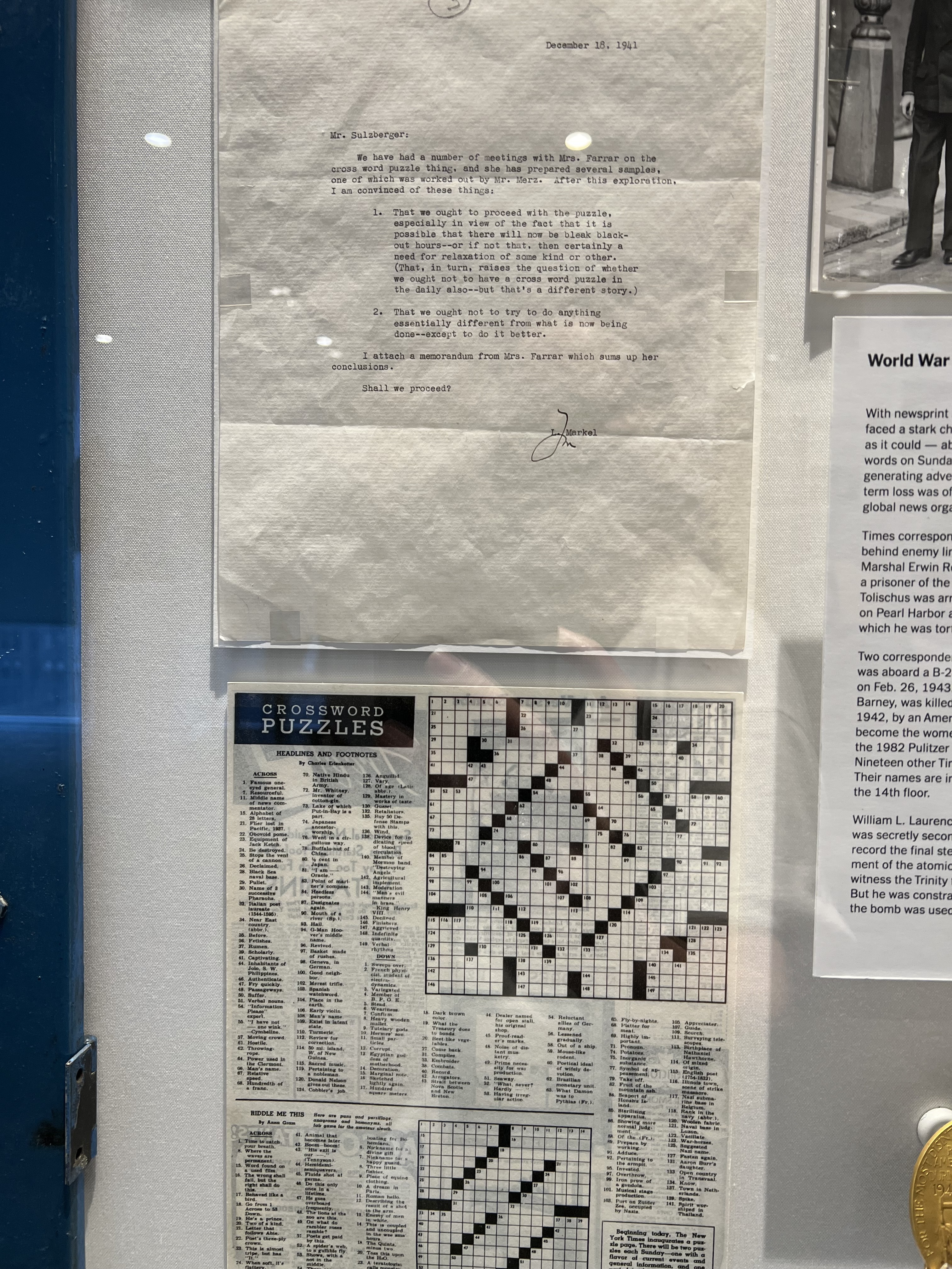 - a letter explaining the decision to begin including games in the NYT (to cheer the general populace after Pearl Harbor), and the first crossword published in the Times