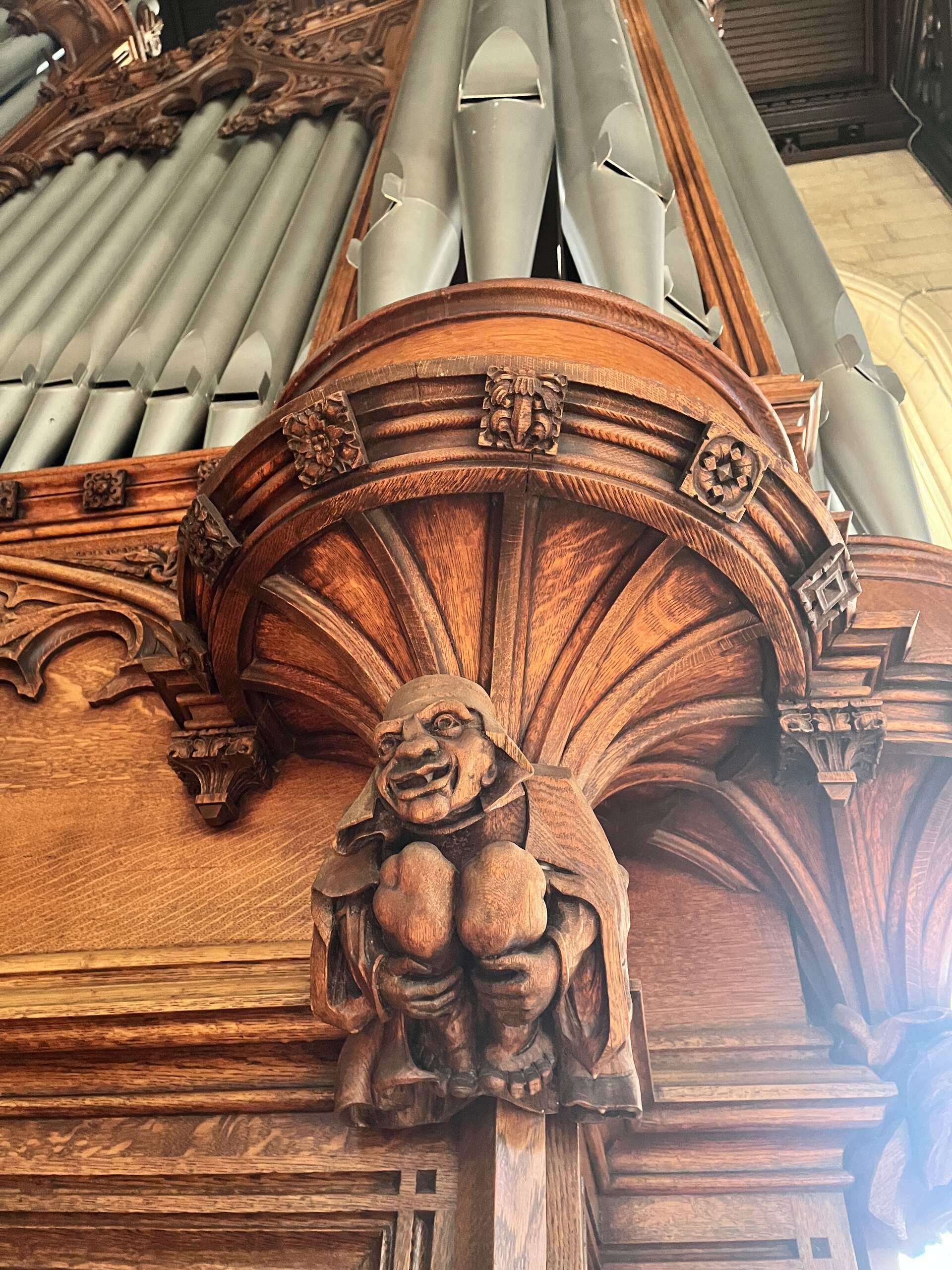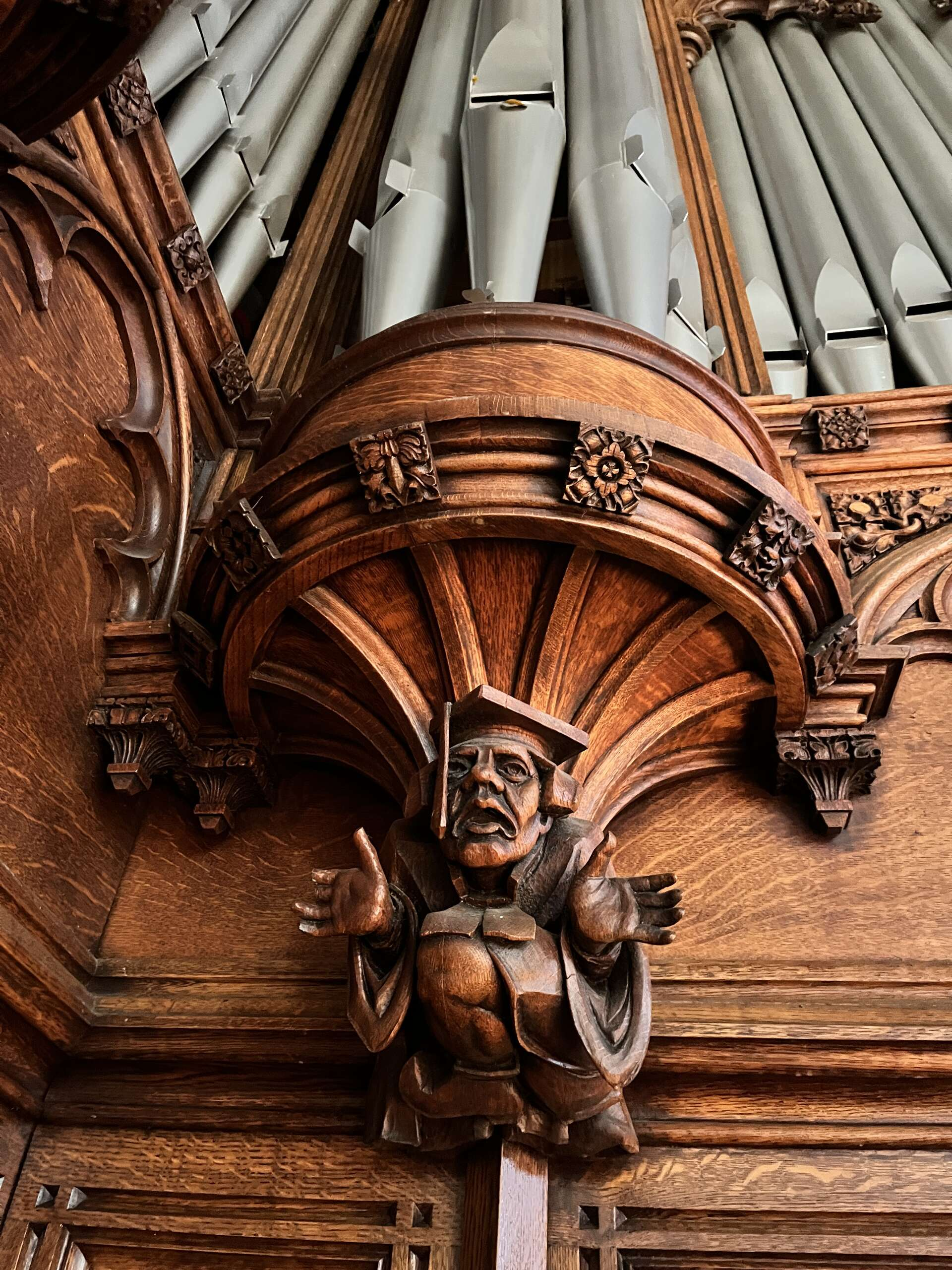 When I stopped by last week, I really enjoyed studying the many little wooden figures in the organ case (which are mostly visible only to the organist and others at the very front of the chapel). For instance, this guy has been around for over 115 years, so one has to assume he has tenure: