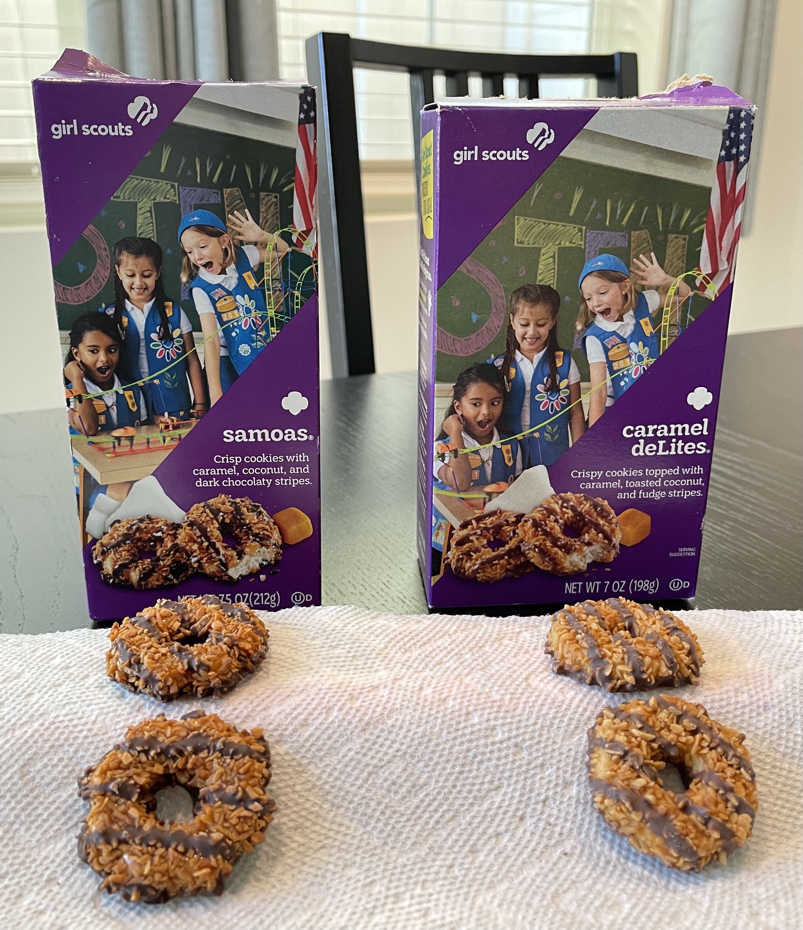 So this time of year is the end of Girl Scout Cookie season here in the US and as I’m originally from the east coast but now live on the west coast I’ve been able to order from multiple Girl Scouts to support friend’s daughters in both locations. This year I managed to double up on my order of these wonderful cookies and got boxes of “the same” cookies from the two different bakeries the GS use here in the US. I decided to set up a little taste test and today’s test is samoas from Little Brownie Bakers LLC and caramel deLites from ABC Bakers.