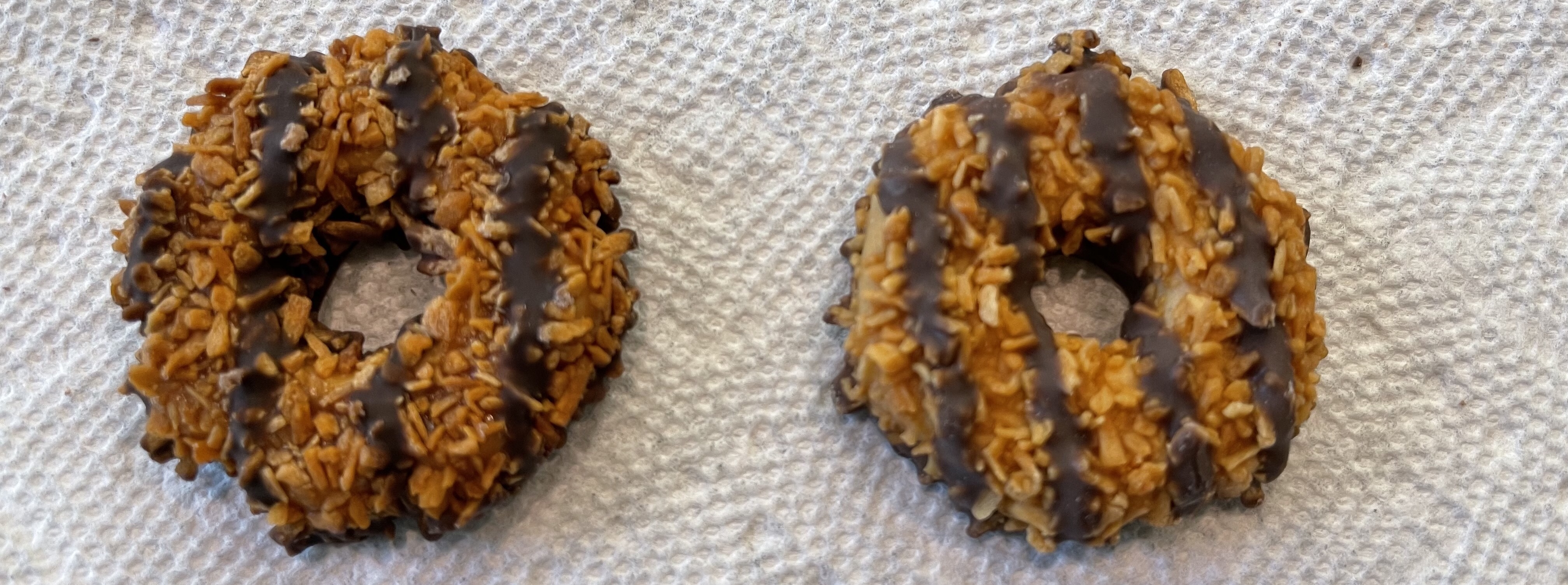 First, let’s start with the box size. Both boxes cost the same but one has 0.5 oz of more cookies in it. Interesting but not a big deal. Second, (since I work in the printing industry) let’s talk about print quality. Comparing the two boxes side by side, the samoas look much more appetizing simply because the box is printed at a much higher quality. Of course, your traditional Girl Scout Cookie customer wouldn’t have the two different products to compare to each other.