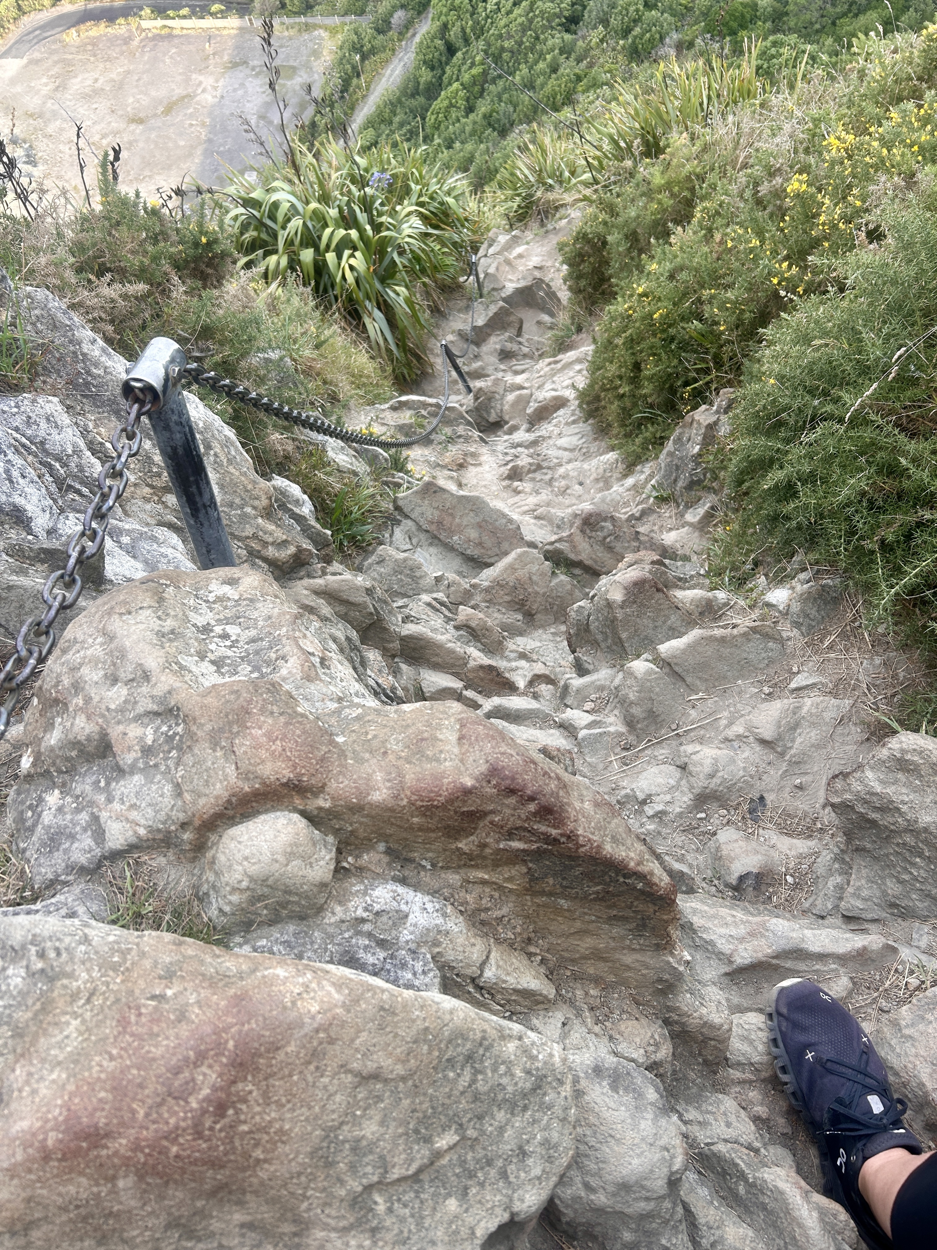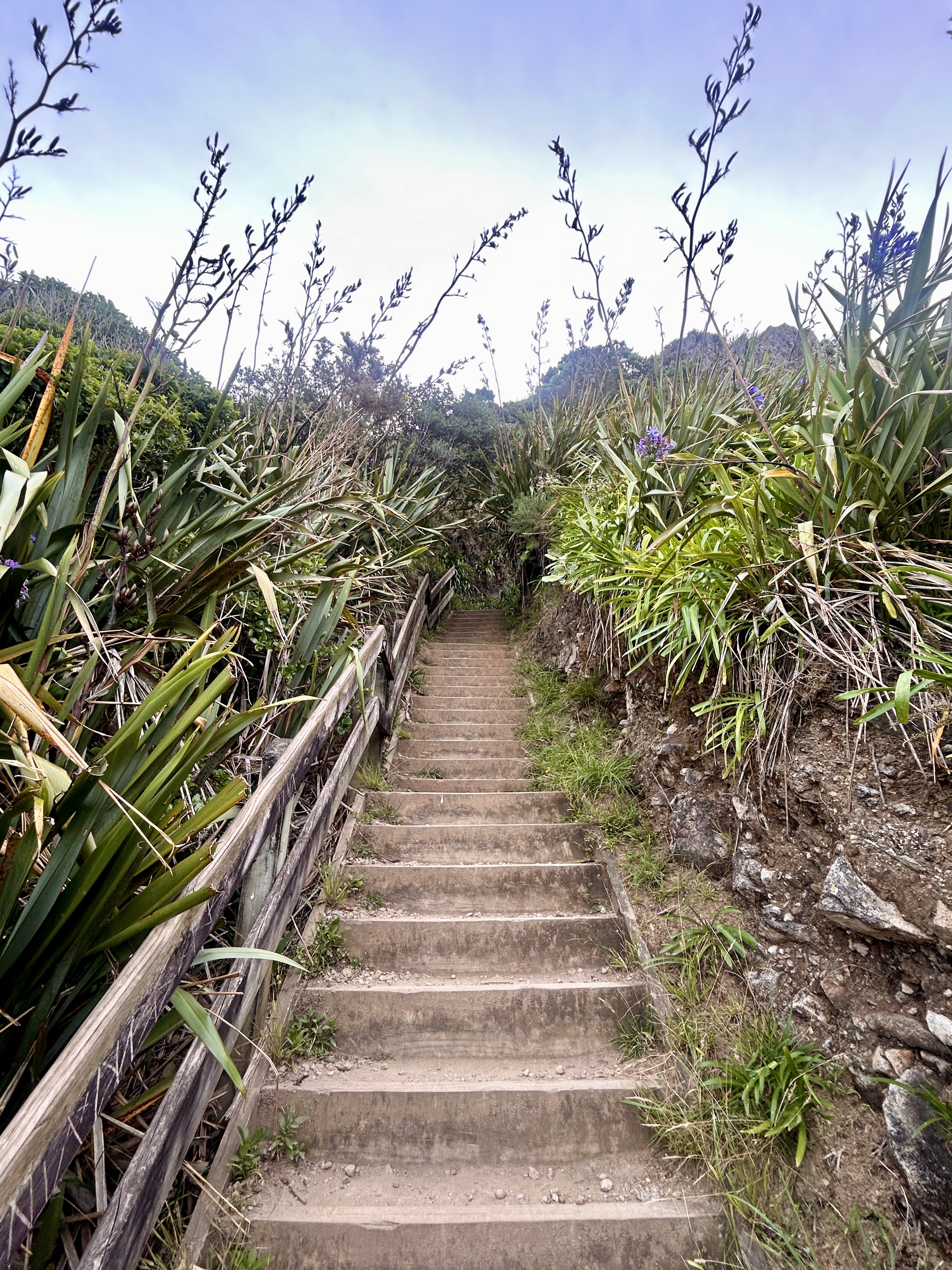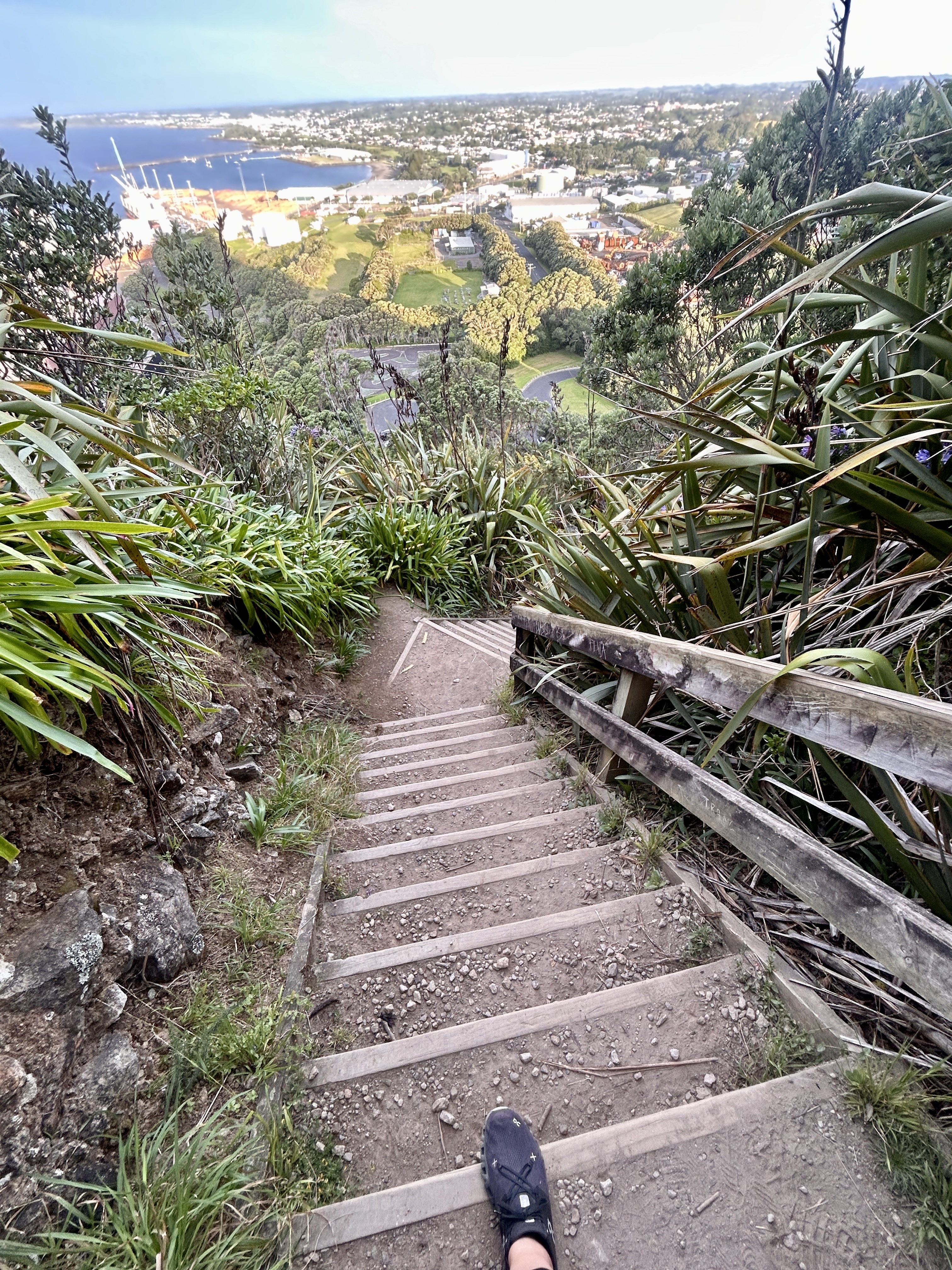 The weather was perfect to so headed over to Paritutu to climb the 156 m / 512 f to the top. It starts with stairs ....