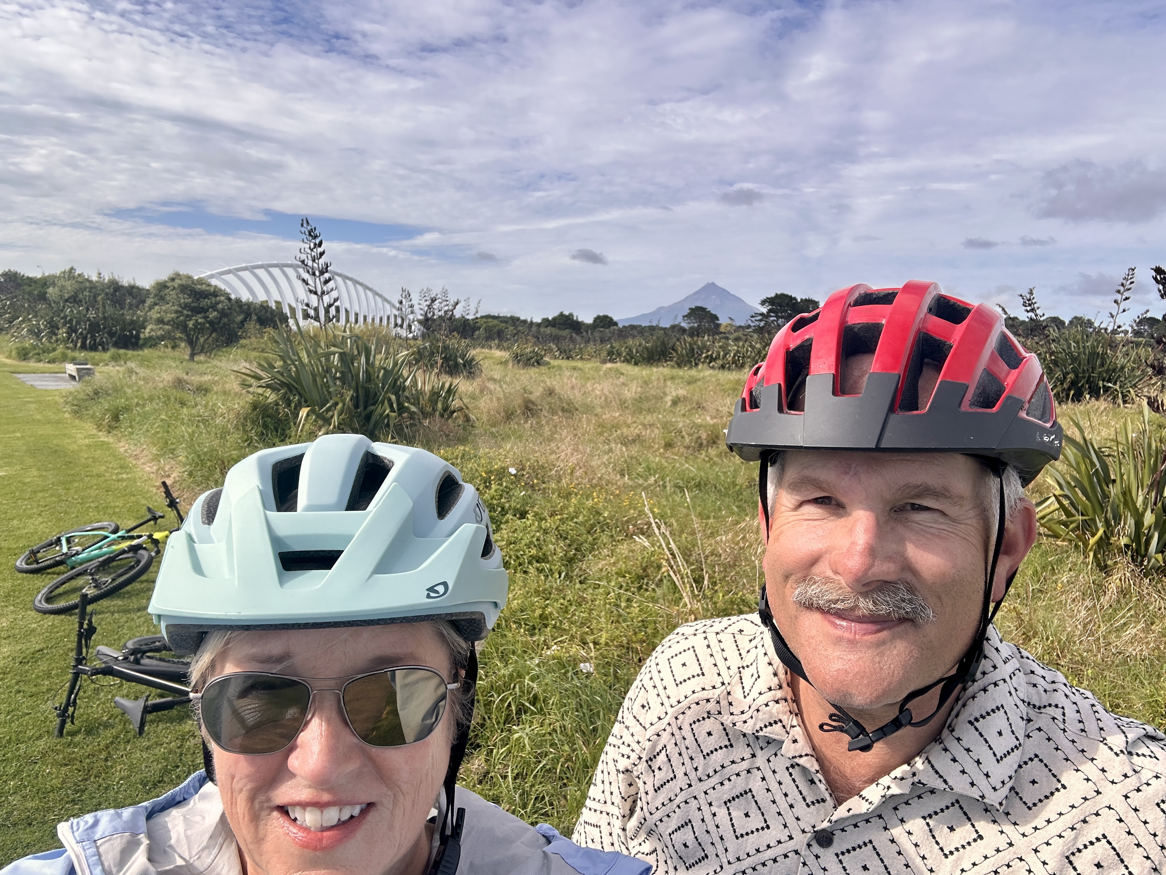 Another fine day so we rode along the Coastal Walkway (Mt Taranaki photo bomb). 🚲