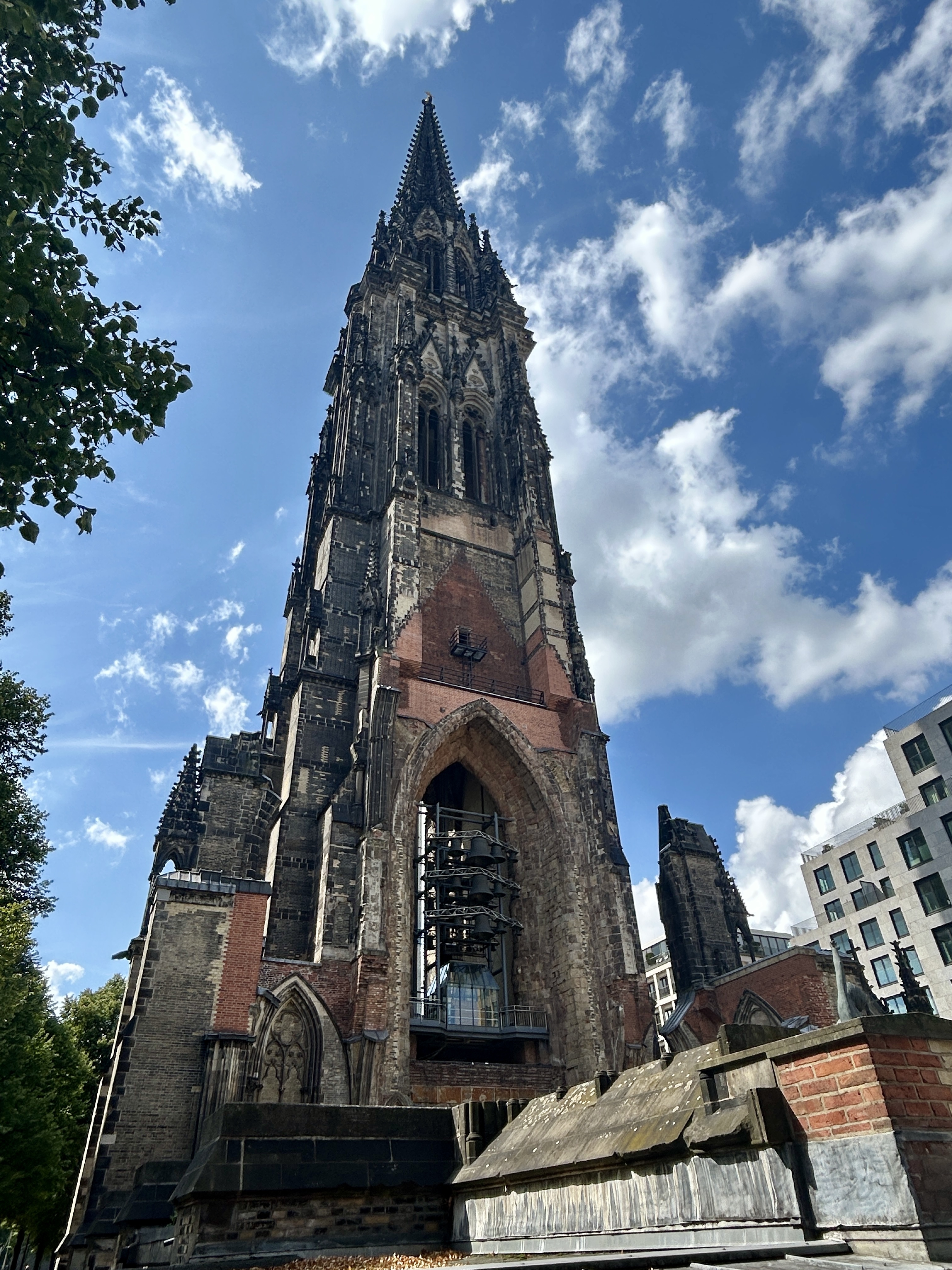 The Church of St. Nicholas is a Gothic Revival cathedral ... The original chapel, a wooden building, was completed in 1195. It was replaced by a brick church in the 14th century, which was eventually destroyed by fire in 1842. The church was completely rebuilt by 1874, and was the tallest building in the world from 1874 to 1876. The bombing of Hamburg in World War II destroyed the bulk of the church.