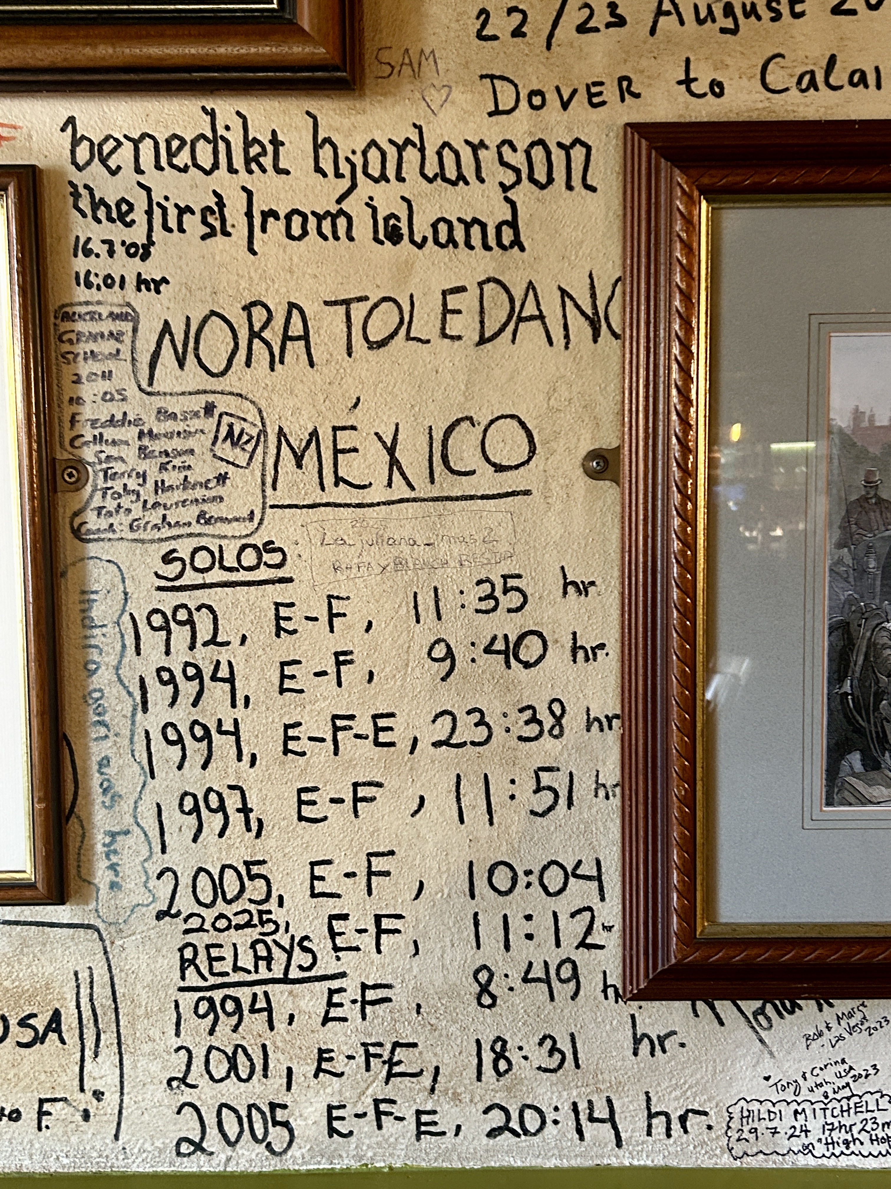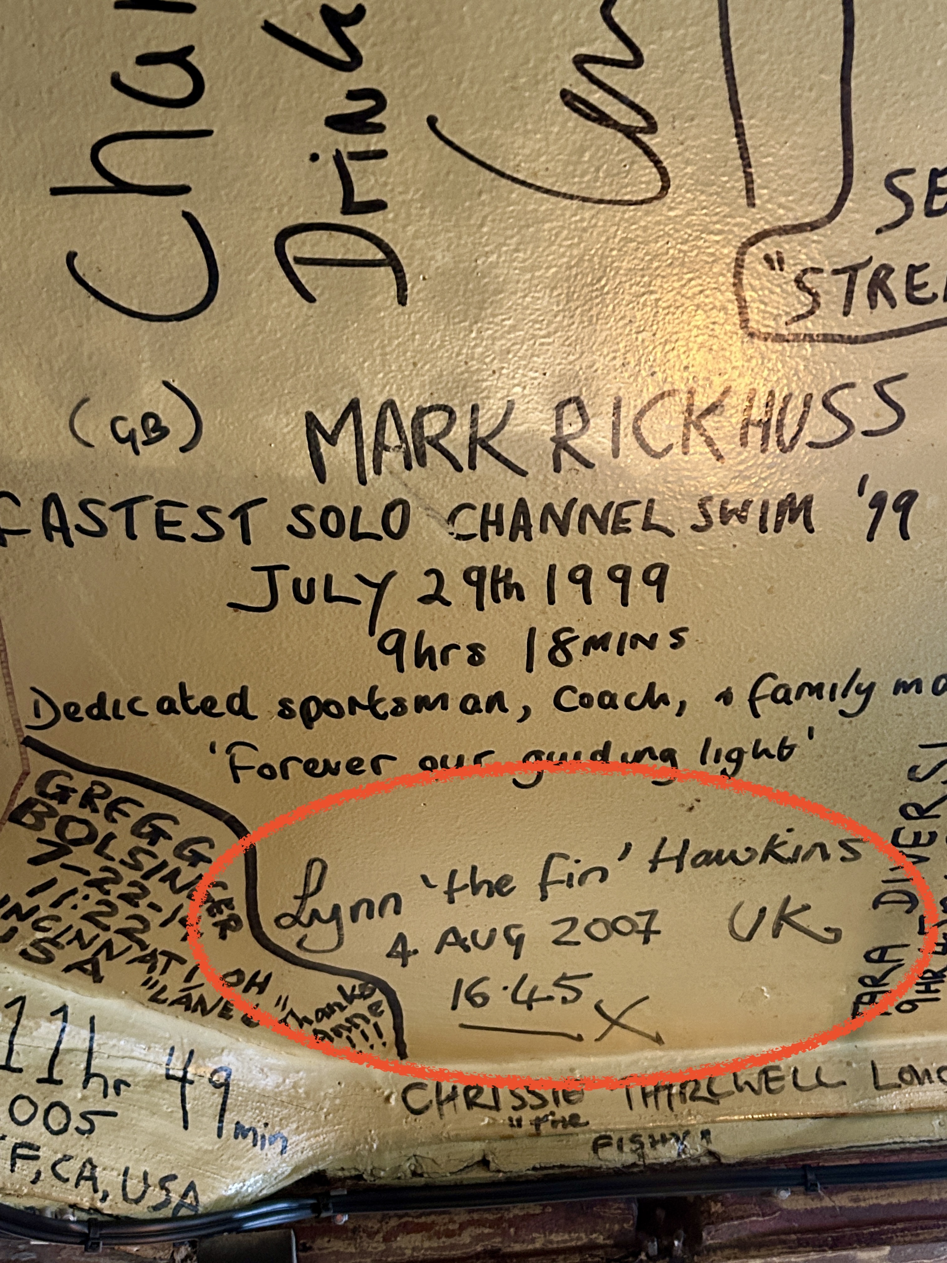 The walls and ceilings were covered with names of people and teams who swam the English Channel from Dover to Calais (some both ways!). My favorite was Lynn 'the fin' Hawkins. ππ»ββοΈ