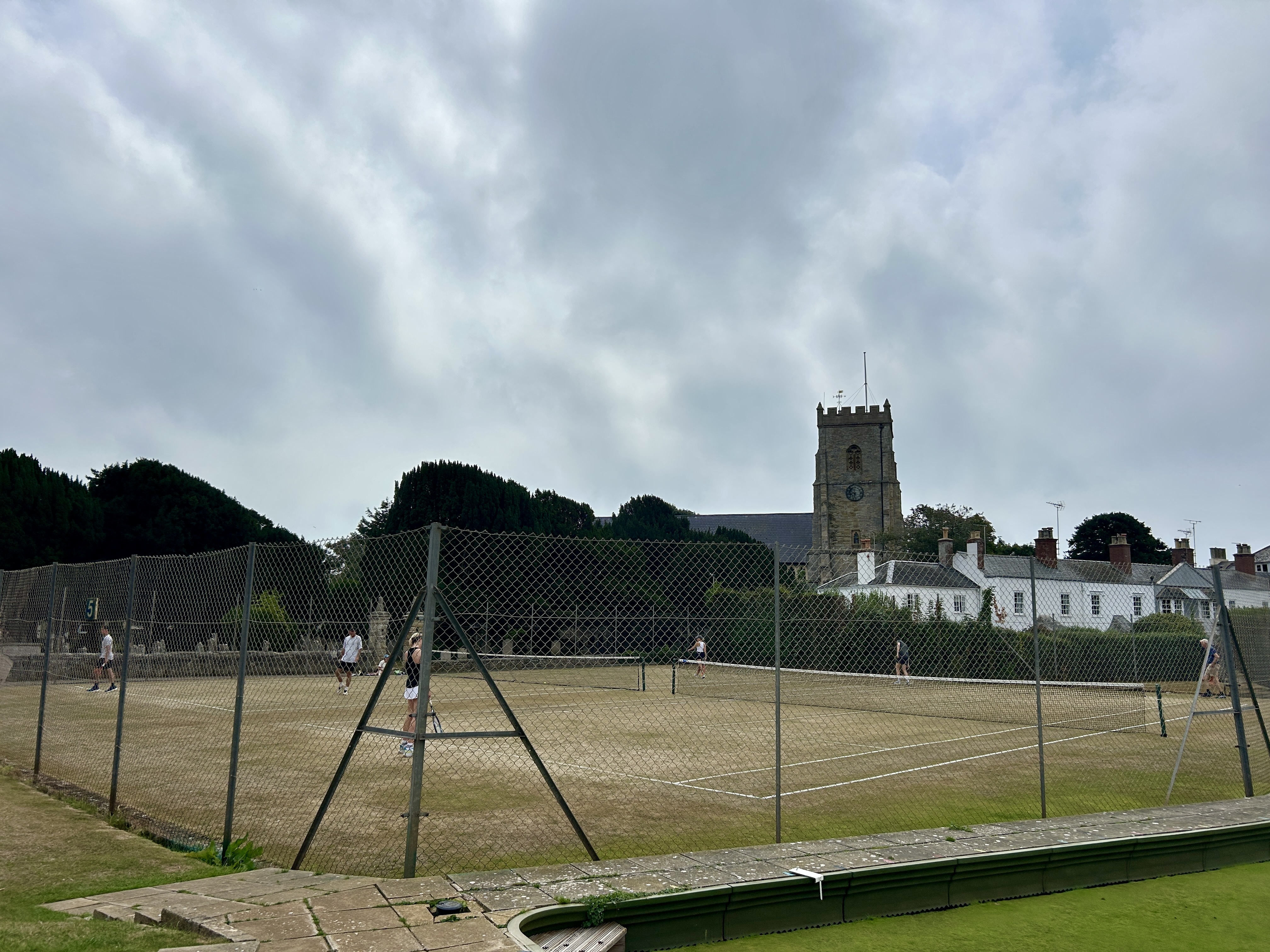 Community grass tennis courts with the parish church tower in the background. 🎾