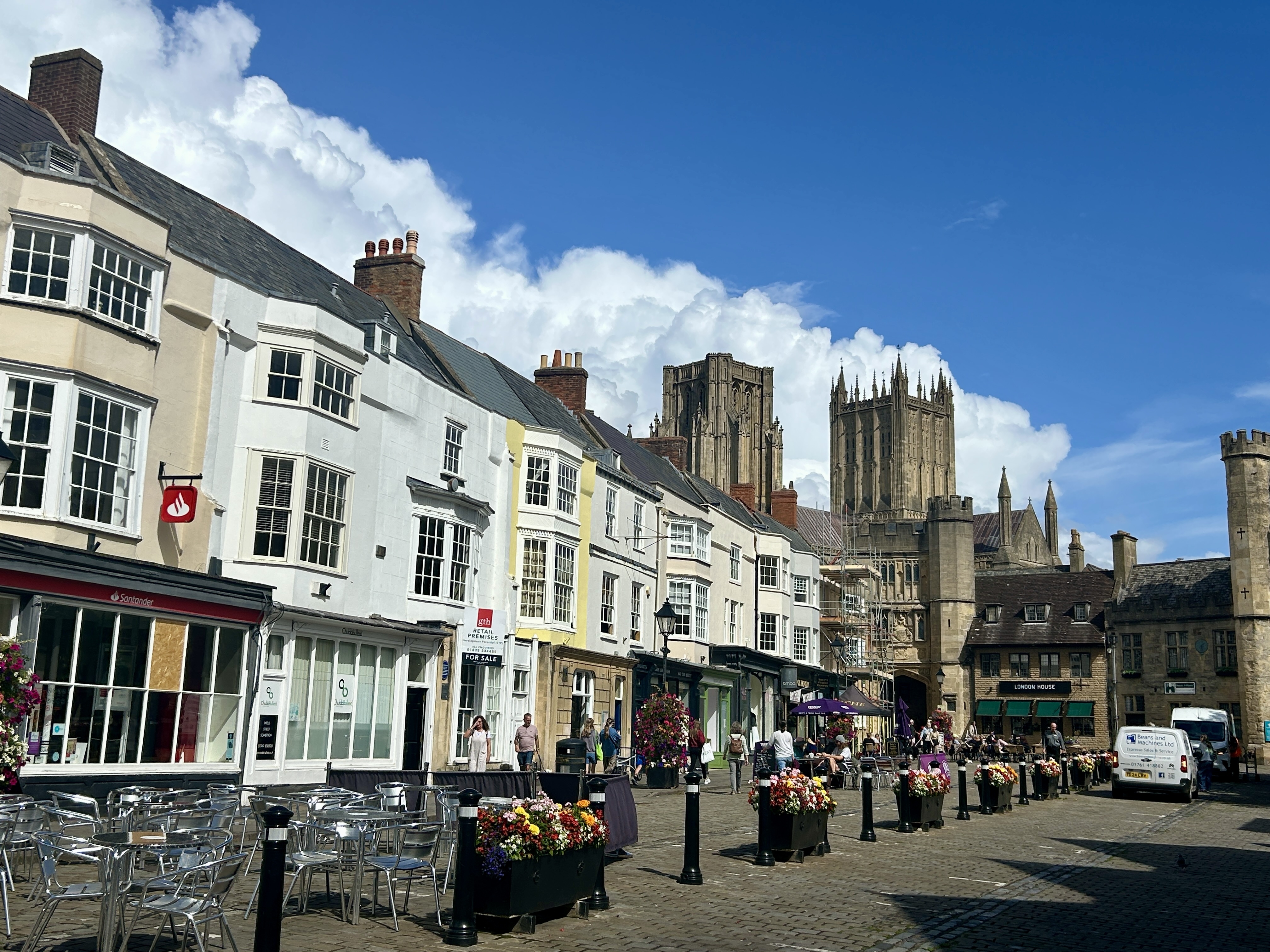 The Wells High Street (what we call Main St in the US) next to the cathedral grounds. 🛍️