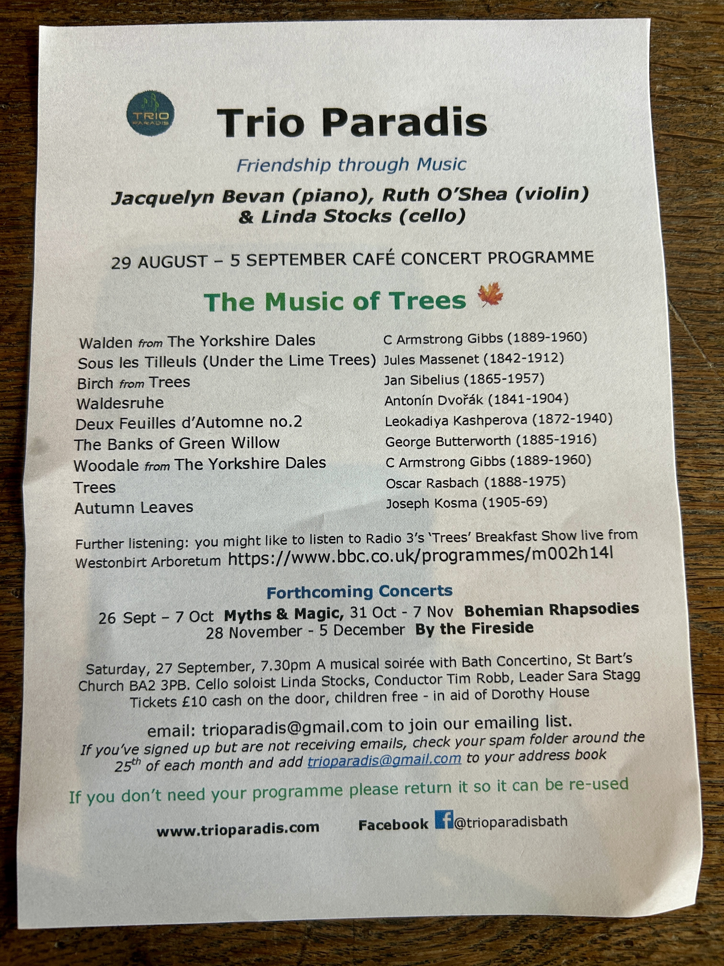 We went back to Wells for an afternoon show called The Music of Trees with Trio Paradis at the historic St. Thomas Church. It was a lovely concert with great sound in a beautiful setting. 🎼