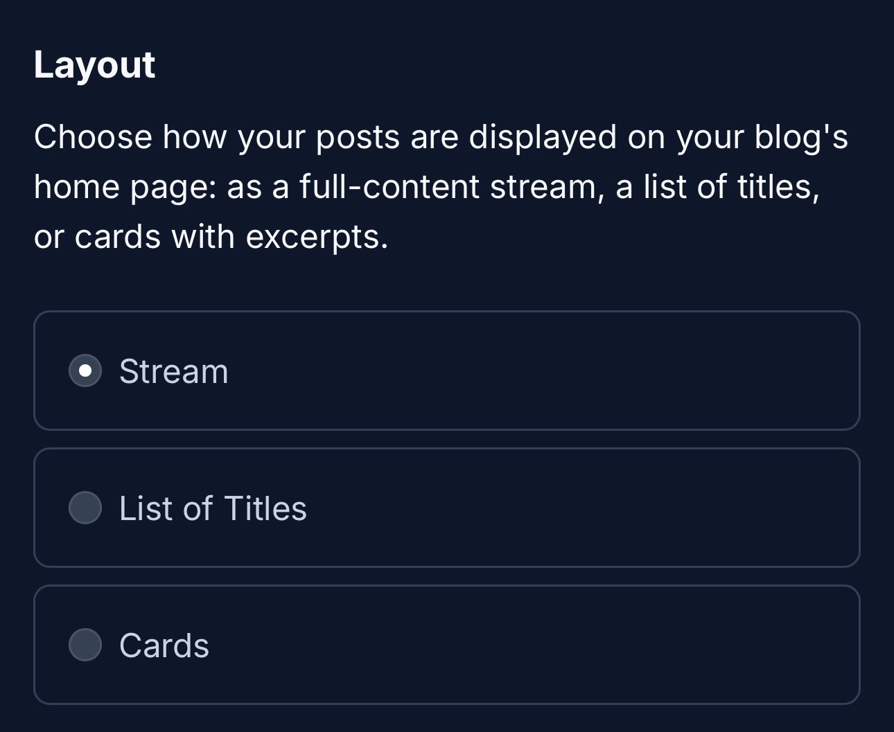 Posts can be displayed as a stream of complete entries one after the other (with nothing for your readers to click through to read further), cards like those on Hey World, or a list of posts if that is your preference.