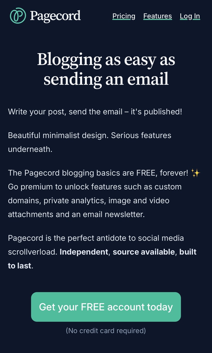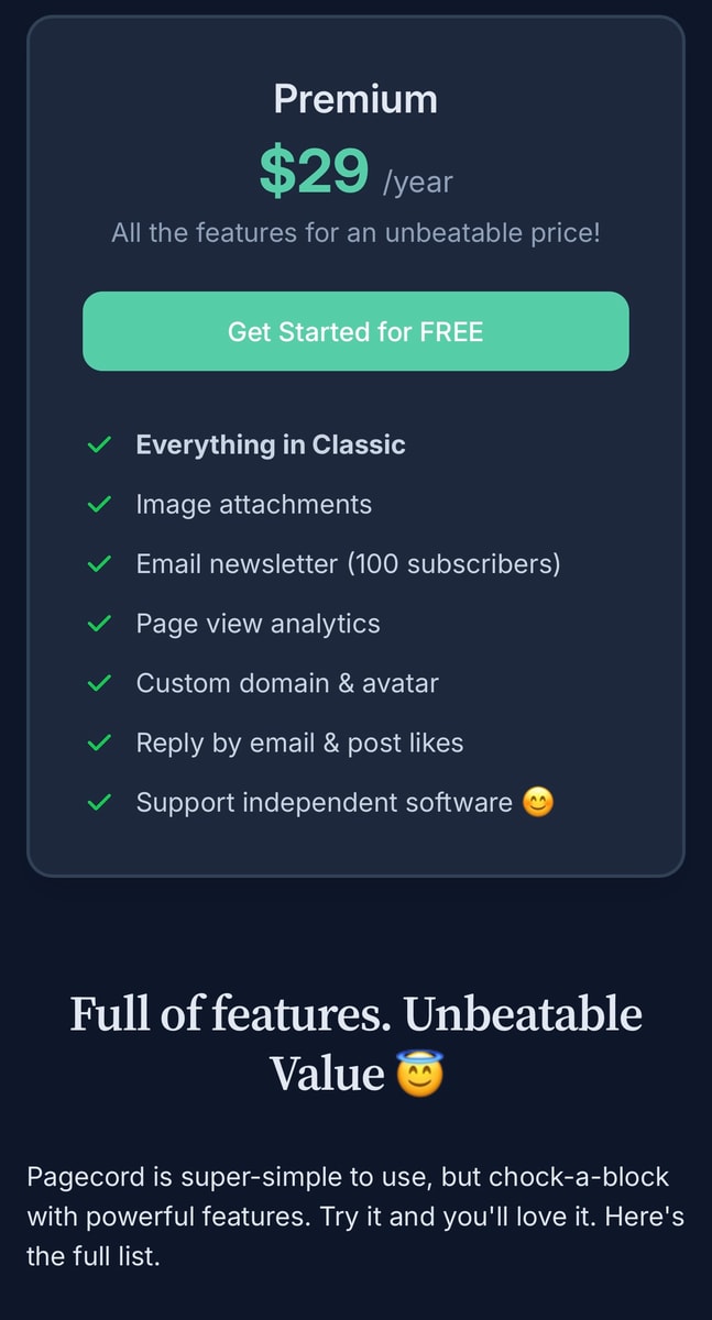 I have researched various blogging platforms extensively. I finally landed on Pagecord a year ago, and I couldn't be happier! I have been a premium user right from the beginning.