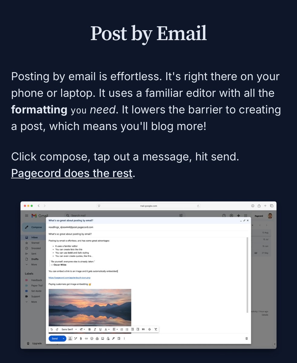 Pagecord lets you effortlessly post by email. You don't have to worry about a slow, non-mobile-first, bloated interface and third party plugins that bog you down (I am looking at you, WordPress). Writing naturally through your email composer should encourage you to write more often. A neat trick is using the Apple iOS Mail app's link preview feature.
