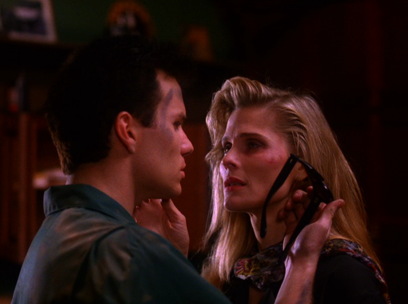 Hence the Vertigo-esque brilliance of the Maddy Ferguson love triangle, which presaged a career of Lynch repeatedly pulling the same move he first developed here. James is "in love" with Maddy because she's a mirror image of the girl he loved and lost. Significantly, he's drawn to her for the same reason that Cooper is drawn to Laura: he feels a deep, futile need to save her. But Maddy's appeal is also that she's not Laura: she's simpler, more straightforward, less challenging, and all this draws James to her too. He doesn't see her as a whole person, but then, nobody does: everyone looks at Maddy the way they used to look at Laura, including Maddy herself, who dearly wants some of the mystery and magnetism of her late cousin. And it leads to the sublime, simple scene where James records "Just You and I," and enlists both of the women he's in love with as backup singers. (Both the words "together" and "forever" have ironic double-meanings in that song: he can't choose between women, because he's pining after a woman he will never see again.) It's an Archie Comics gag played as tragicomedy.