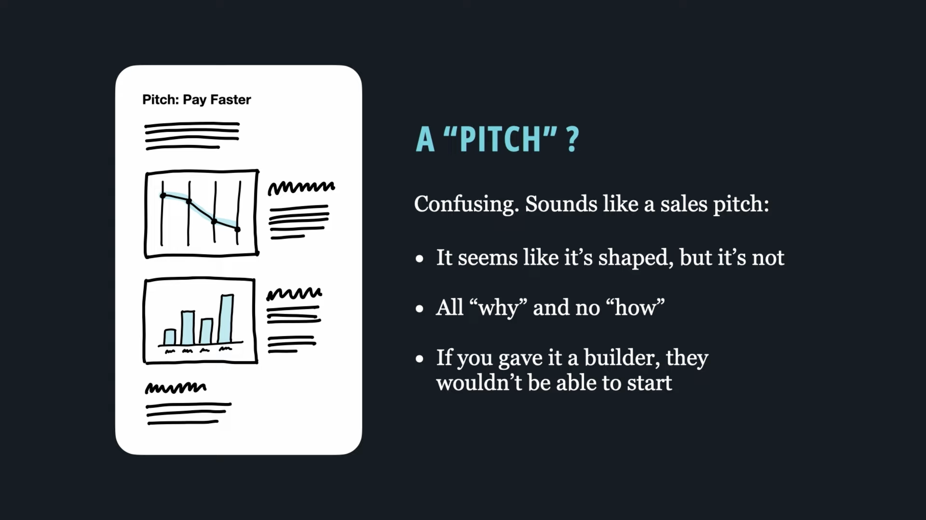 寫好 pitch 我認為是最難的,因為這不只關係到前期的「要解決什麼問題」("Framing" in his language),也關係到 shaped 後,是否有足夠能量去寫成 buildable。