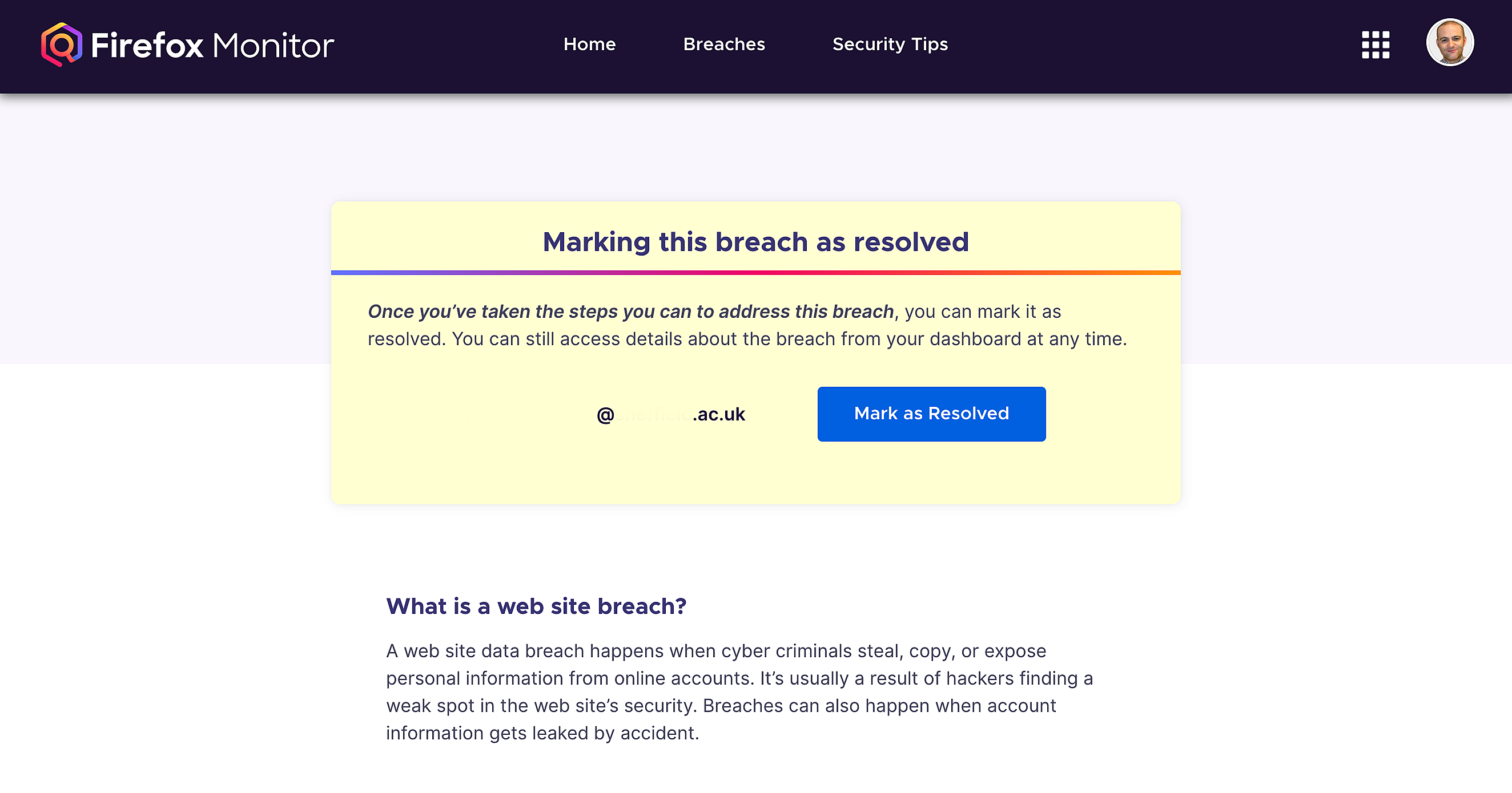 Once signed in, the Firefox Monitor home page will change to display a personalised breach summary. The breach summary will list how many email addresses are being monitored(you can monitor as many email addresses as you like), how many data breaches have occurred and if you have marked these as resolved or not. You can manually mark a data breached as resolved if you feel you have taken the recommended steps to mitigate the breach, for example changing your password.