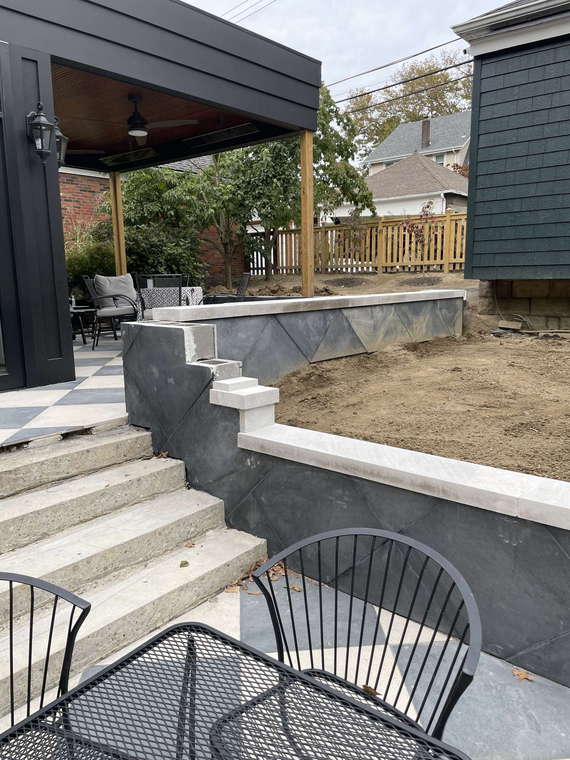 Today, the guys started dry fitting our Indiana gray limestone wall caps and stairs. We positioned the under-stair lights. Got the lamppost installed and the light is now on my smart app to control, dug the trench for running gas to the middle of our yard for the fire feature. Crazy day!!