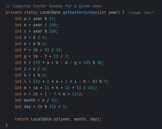 Aujourd'hui, j'ai découvert l'algorithme pour déterminer la date de Pâques! Je savais que ce n'était jamais à la même date à chaque année et que c'était basé sur le cycle lunaire mais jamais j'aurais pensé que le calcul était aussi complexe. En fait, je n'avais jamais de besoin d'affaire de le déterminer dans mon travail.