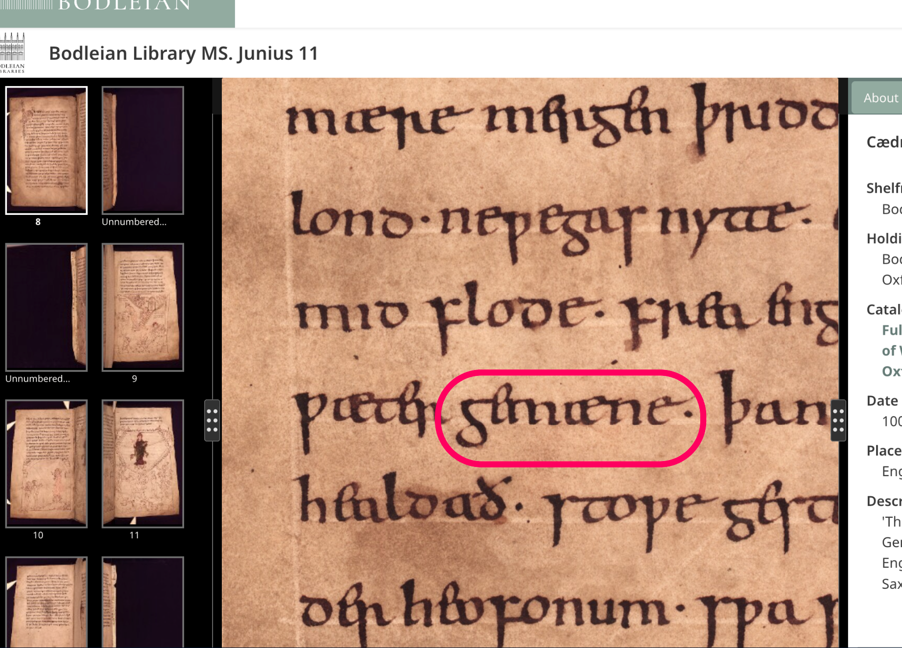 Since I was using the original Old English word for commons as my visual basis for the logotype, it only made sense to base it on the writing system of that time. So I went looking for an original transcript that actually includes the word "gemæne". It took a little bit of digging, but I found an entry from the Junius Manusript, written in 1000 AD.