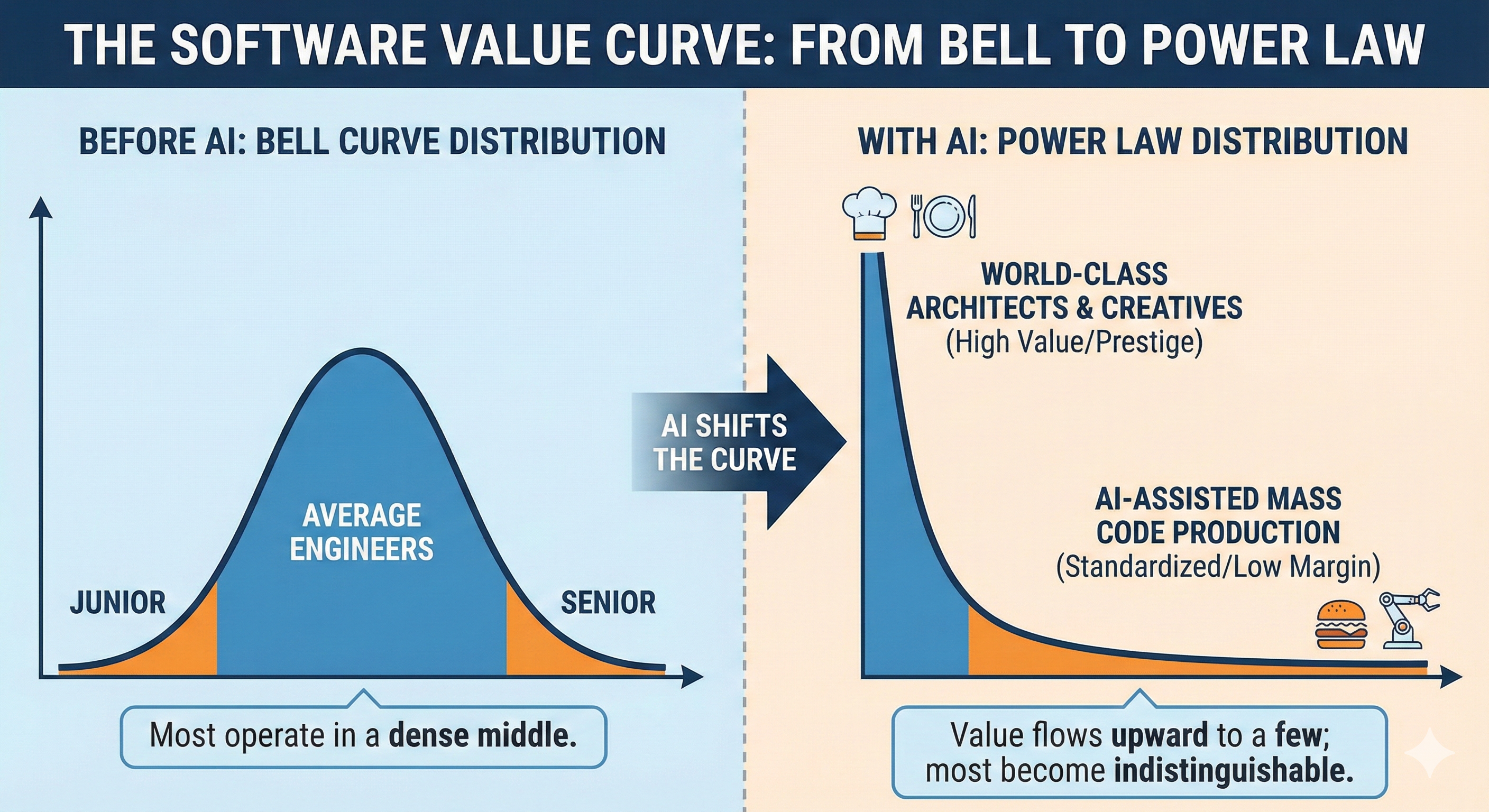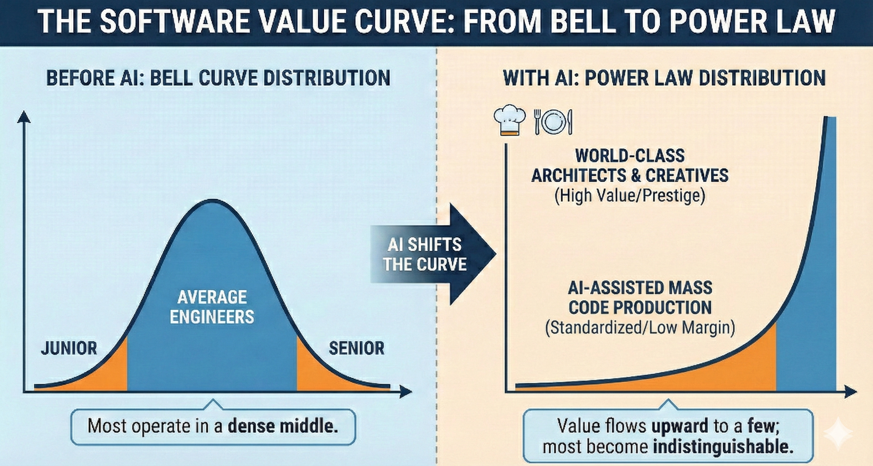 AI has made code production cheap and plentiful. It’s the equivalent of mass-produced meals. But in this abundance, value flows upward, concentrating in those who bring coherence, creativity, and judgment. The ones who design the menu, not just cook from it. In tech: senior engineers, staff engineers, architects.