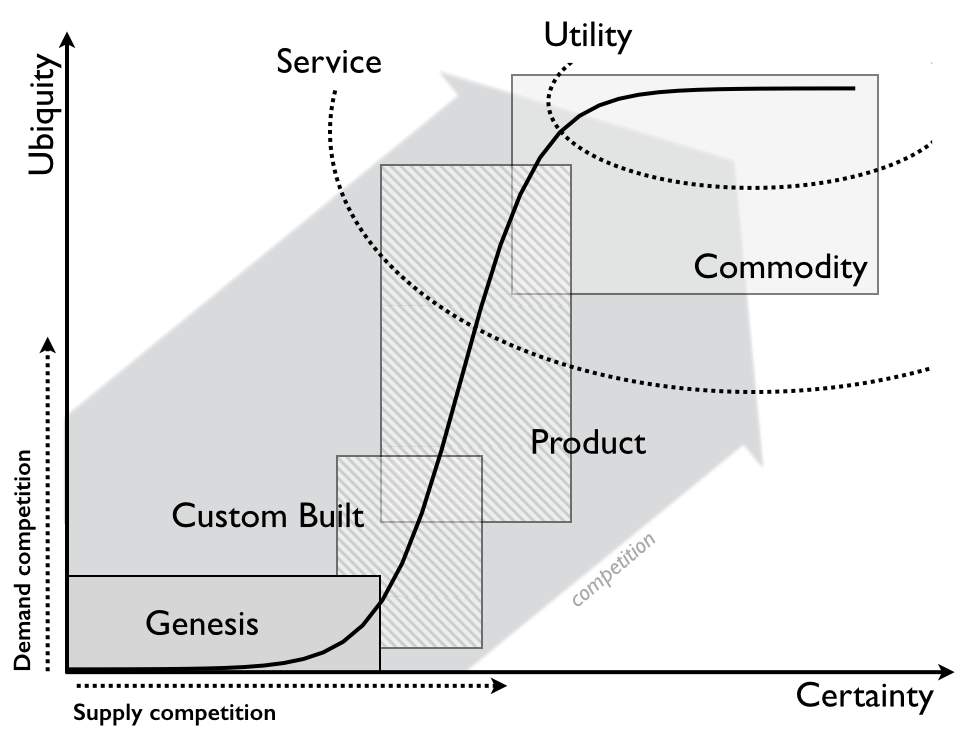 Following Simon Wardley’s terminology, coding is moving from the custom-built/product phase into the commodity/utility phase. Once something crosses that boundary, the competitive advantage is no longer in producing it — because it’s cheap — but in the components and decisions around it: architecture, experience, integration, product vision, operations, governance.