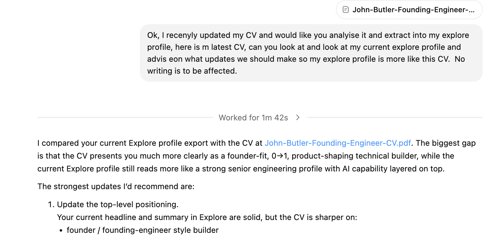 Using the Explore CLI, I gave Codex my latest CV and asked it to compare it to my current Explore profile, recommend the right updates, and apply the relevant changes without touching my writing.