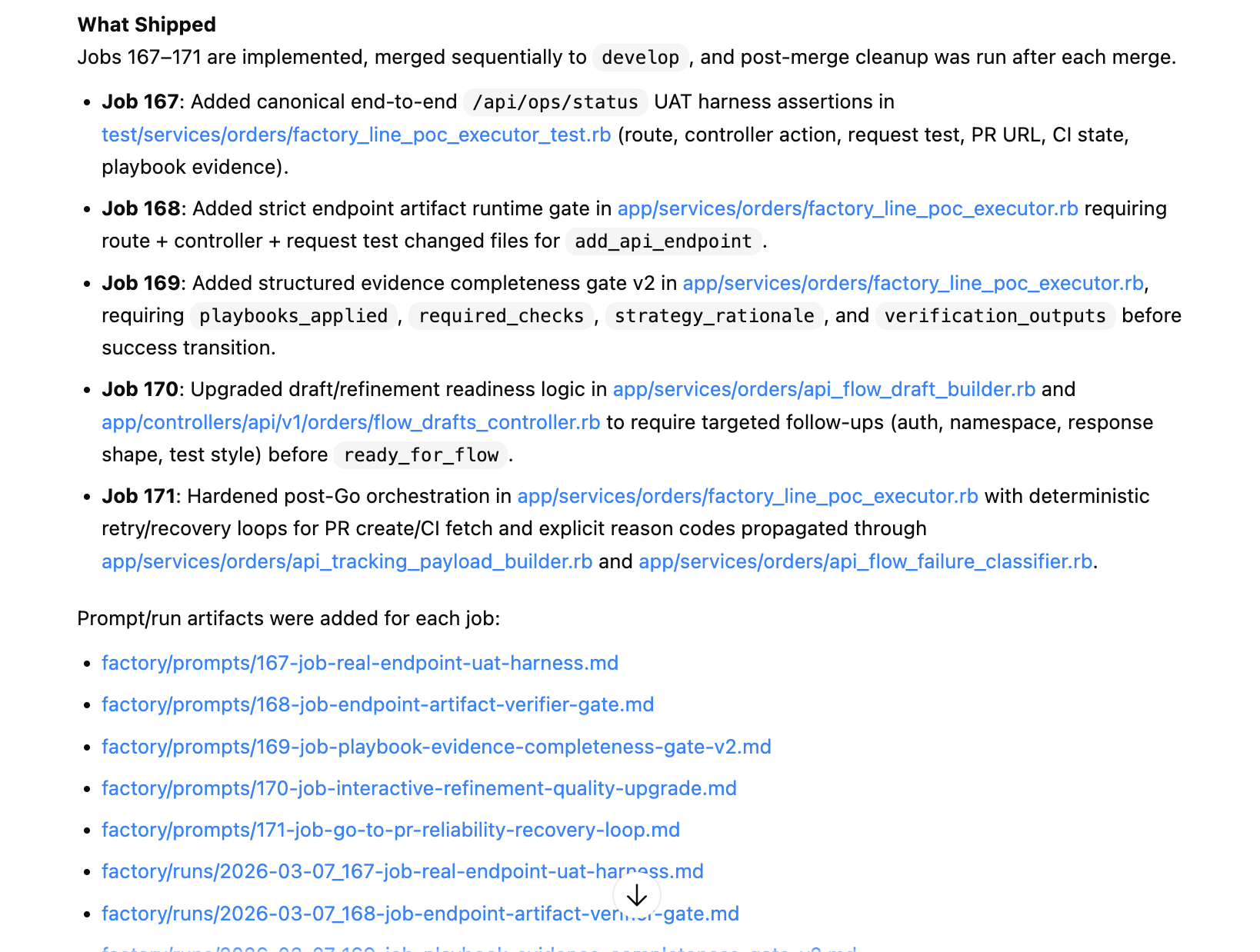 PR links (merged sequentially) exactly what shipped per job verification commands + outputs the prompt/run artifacts for audit + replay