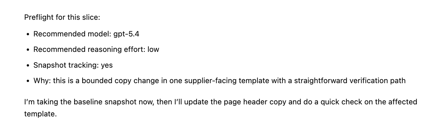 preflight recommendation before the slice starts baseline snapshot taken before implementation delta-based AI usage in the PR estimated tokens, cost, model, and reasoning effort