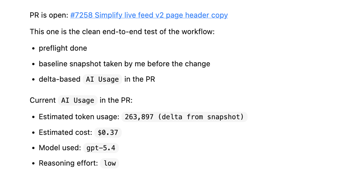 But that’s enough to be useful: for cost visibility, for reviewing scope, and for improving how each repo uses AI over time.