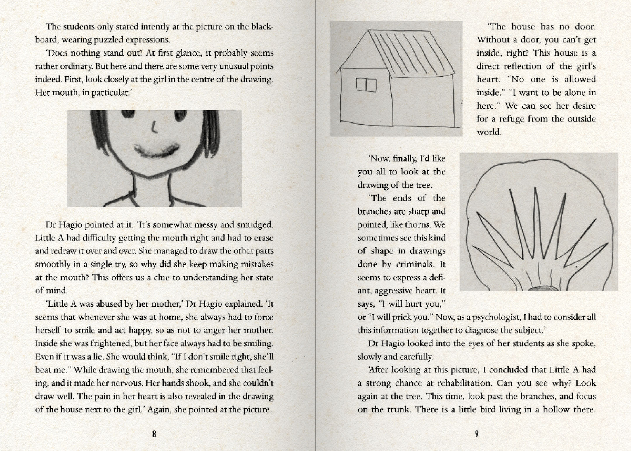I picked up this weird mystery novel in Foyles and was immediately intrigued by the addition of drawings sprinkled throughout the text. It transpires the visual material is integral to solving the murder mystery penned by Japanese author Uketsu (雨穴), who themselves remained anonymous in the guise of an all encompassing black leotard and papier-mâché mask.