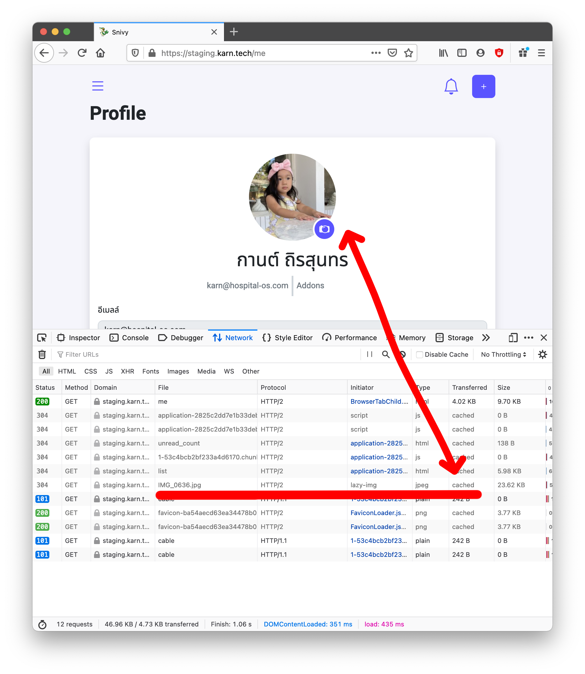 จากข้างต้นทำให้เมื่อเราเปิดเว็บจะต้องทำการโหลดภาพใหม่ถูกครั้ง แทนที่เบราว์เซอร์จะดึงภาพที่ cache ไว้มาแสดงผล หลังจากที่พยายามหาวิธีอยู่หลายชั่วโมง ก็พบว่าใน Rails version 6.1.0 ขึ้นไปจะมีการอัพเดต Active Storage ให้รองรับโหมด proxy ที่ทำให้เรา cache ภาพได้ ซึ่งเราอาจจะกำหนดค่ามาตรฐานให้อยู่ในโหมด proxy โดยเซทที่ `config.active_storage.resolve_model_to_route` เป็น `:rails_storage_proxy`