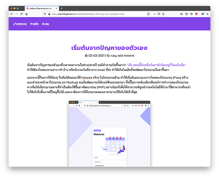 จากแนวทางการใช้งานข้างต้น ต้องบอกเลยว่าเหมาะสำหรับมือใหม่ที่อยากมีเว็บส่วนตัวมาก เพราะไม่ต้องทำการติดตั้งเว็บไซด์ หรือเช่าบริการใดๆ เลย ยกตัวอย่างจากเว็บบล็อกของตัวผมเองซึ่งใช้ Jekyll และติดตั้งผ่าน Github Pages ซึ่งแม้ว่า Github Pages จะ hosting เว็บไซด์โดยไม่เสียค่าใช้จ่าย แต่ก็ต้องเสียเวลาในการกำหนดค่า Jekyll อยู่เป็นเวลานานโดยเฉพาะอย่างยิ่ง CSS ในส่วนแสดงผลหน้าเว็บดังแสดงในรูปด้านล่าง