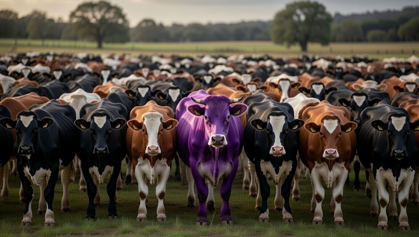 But one day, you glance over and see a Purple Cow. Standing there, contrasting like a white dot in a pool of a million black dots.