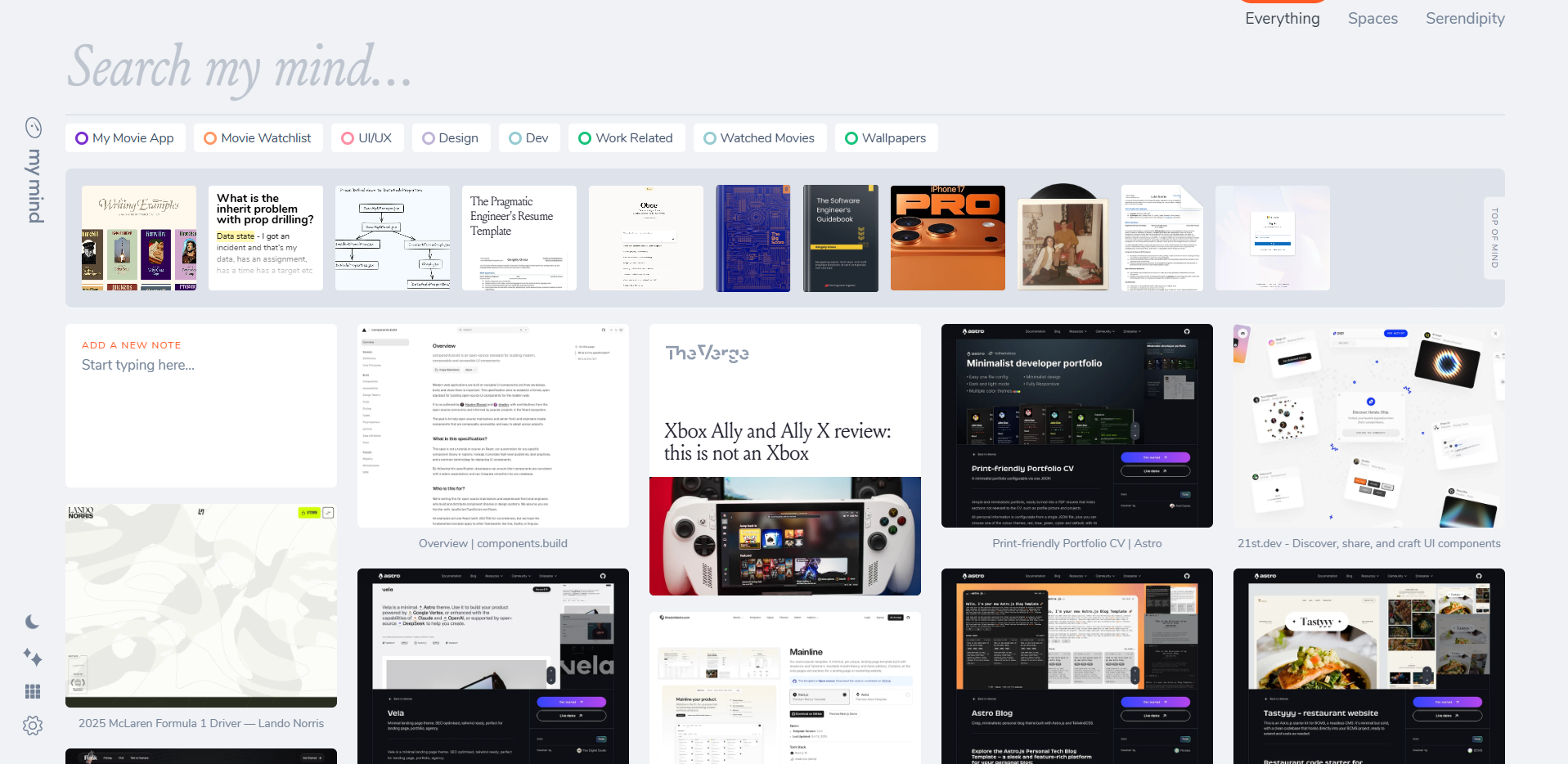 Above is MyMind, you can see the types of things I have saved and each item has its own unique design when saved (see the Father Figure album saved as a vinyl record!)