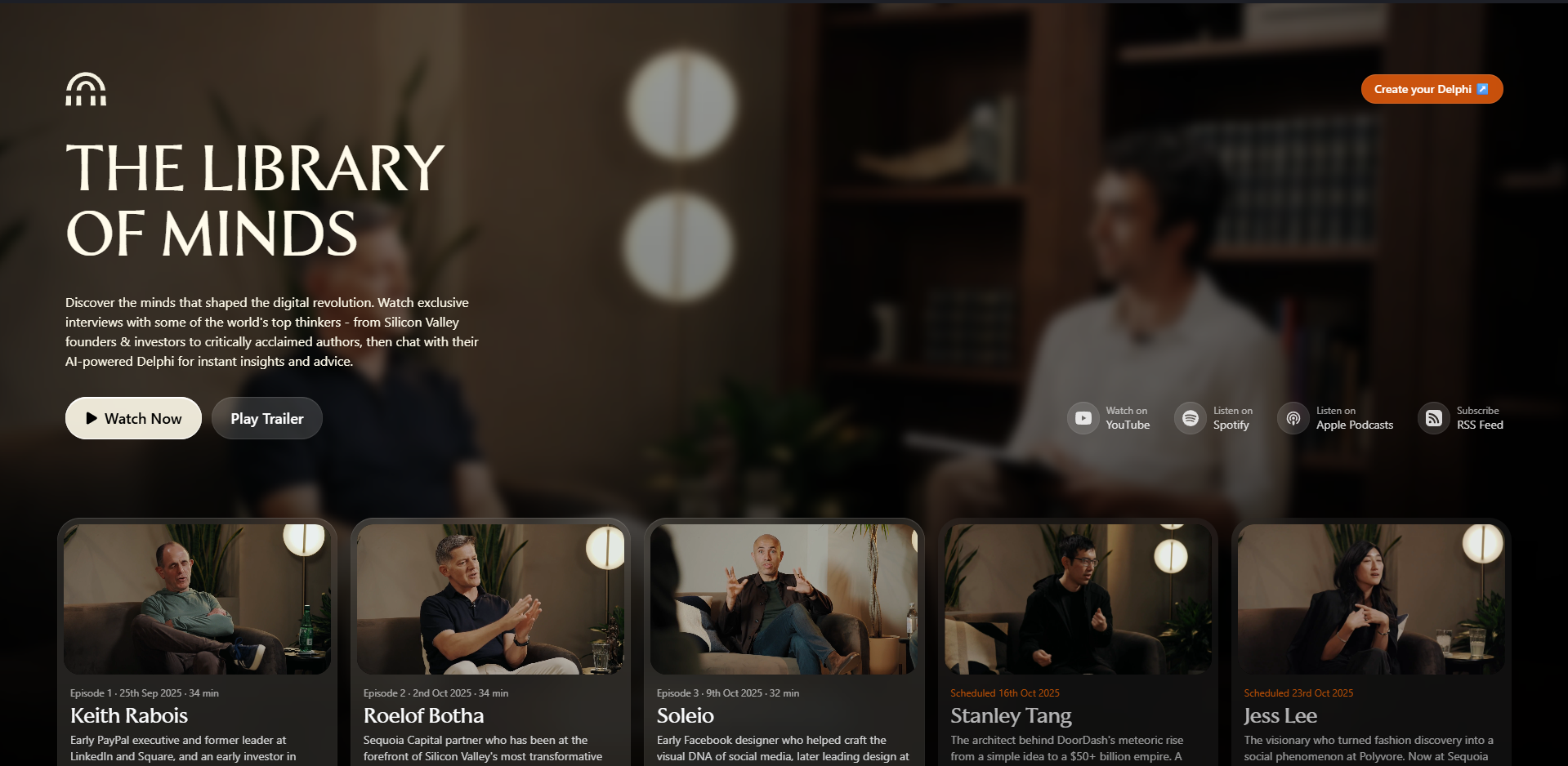 This website showcases AI Delphi, a LLM powered assistant that lets you chat with someone's persona. But that isn't the focus for today. The real highlight is The Library of Minds - a collection of exclusive interviews featuring Silicon Valley investors to critically acclaimed authors. I have found the episodes insightful and you don't even need to interect with the AI if you don't want to. The website design is beautiful, the blurred background is actually a video playing which I think adds a level of dynamism.