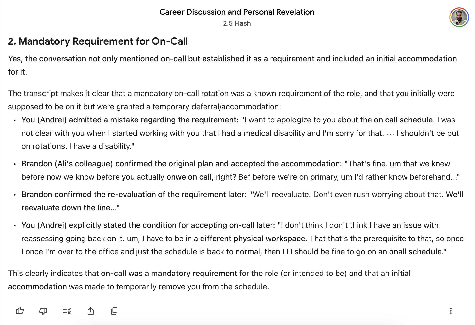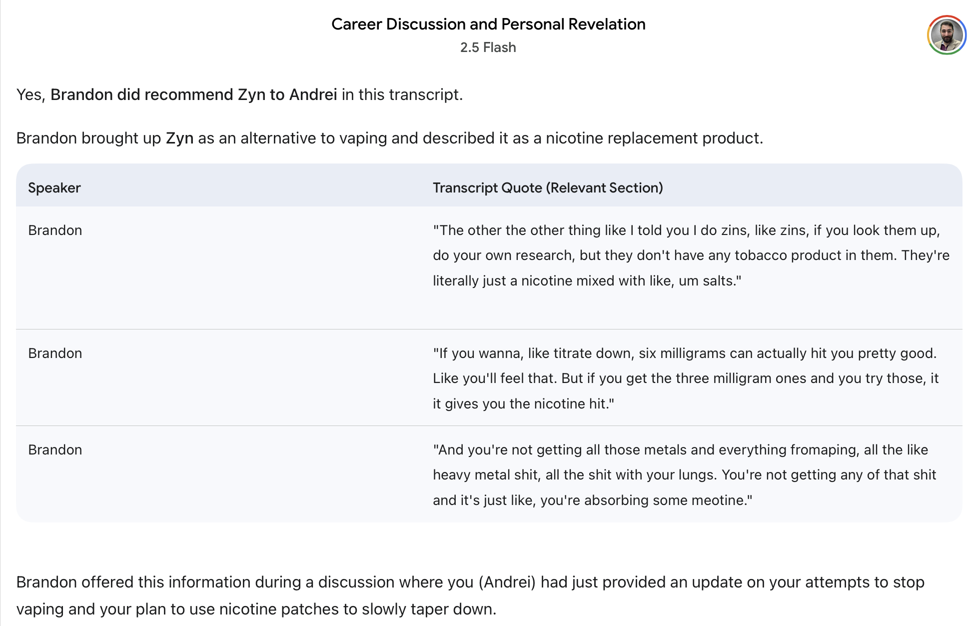 Since I have all of the transcripts on recording, I am able to pass them through Gemini in order to better understand the communication being made to me: