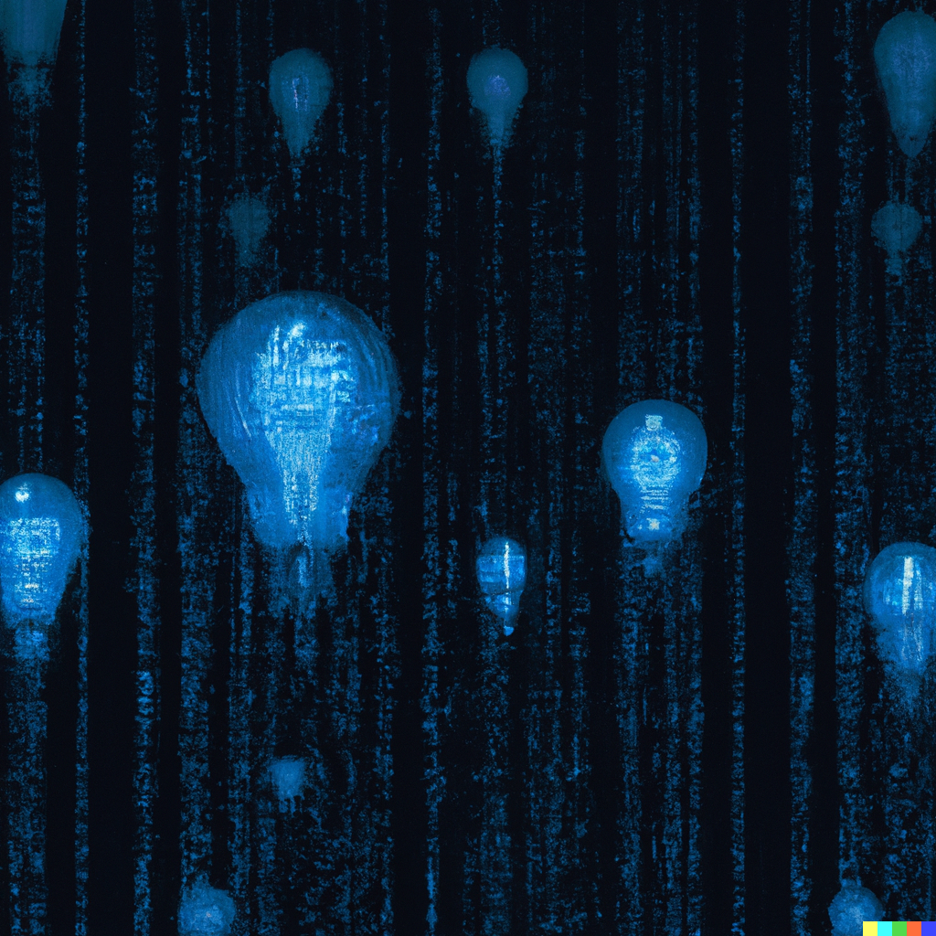 "the matrix background in dark blue with AI lightbulbs digital art" - DALL·E.