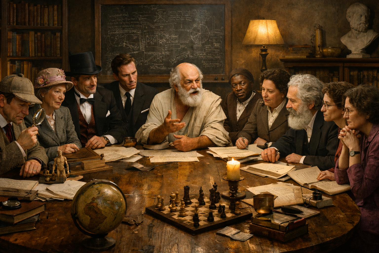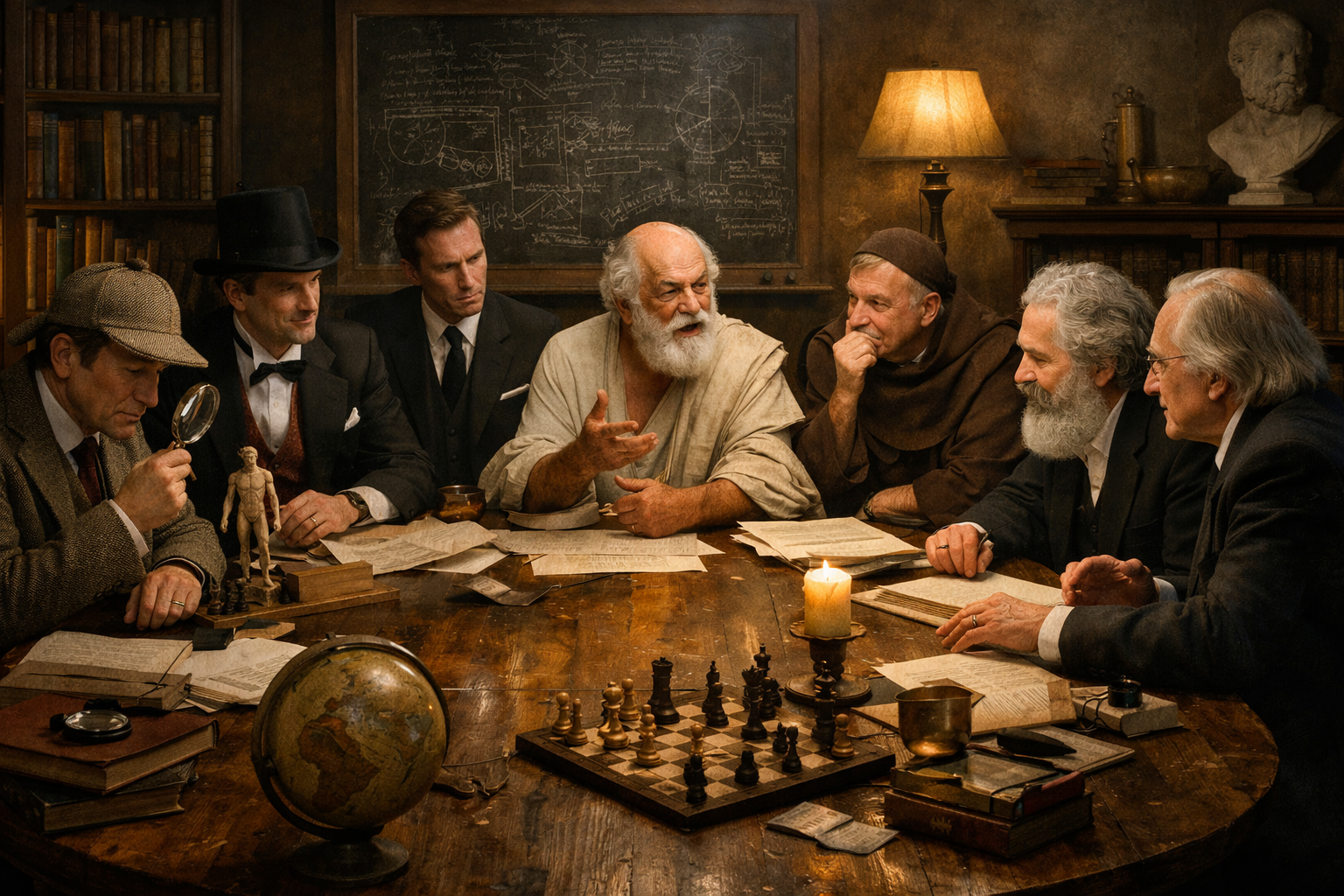 Dus verzon ik een list: een heel team van virtuele dwarsdenkers en analisten, samengesteld uit historische en fictieve figuren die bekend staan om hun unieke manier van kijken en denken. Aanvankelijk stond Tijl Uilenspiegel er ook tussen, maar die was net iets te dwars en heb ik ontslagen 🤣.