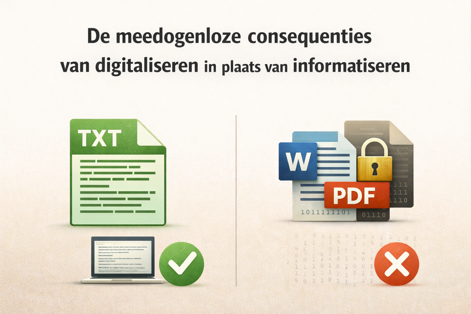 TL;DR Er bestaan maar twee soorten computerbestanden: tekstbestanden die een computer direct kan lezen en binaire bestanden waarvoor speciale software nodig is. Vrijwel alle documenten in organisaties worden opgeslagen in binaire formaten zoals Word en PDF, formaten die in essentie printerinstructies zijn. Dat is geen onschuldige gewoonte. We hebben dertig jaar lang gedigitaliseerd in plaats van geïnformatiseerd: papieren processen overgezet naar een scherm zonder de informatie los te maken van haar drager. Het gevolg is een keten van afhankelijkheden die miljarden kost aan ICT. Archieven worden ondoorzoekbaar en we bouwen energieverslindende AI-systemen om informatie te bevrijden uit formaten die nooit bedoeld waren om informatie in op te slaan. Het alternatief bestaat al en is simpel en goedkoop. De drempel is niet technisch maar organisatorisch.