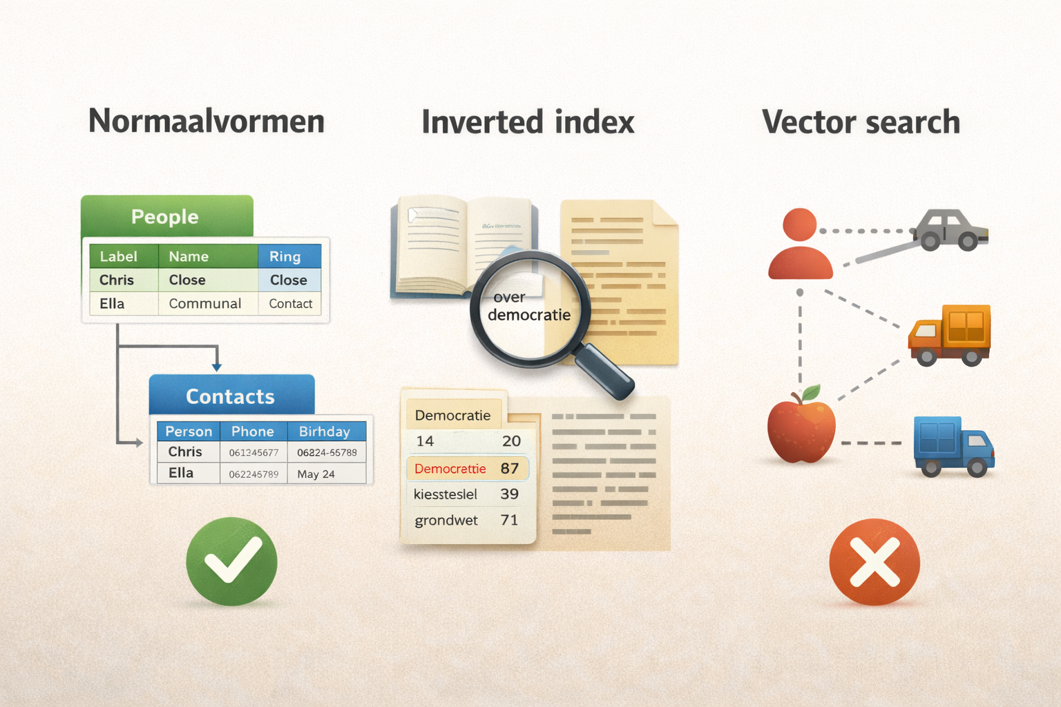 Wat ik geweldig vind is het verband tussen deze drie mechanismen. Normaalvormen dwingen je dus om gegevens schoon op te slaan, een inverted index maakt ze doorzoekbaar op woorden, en vector search voegt daar iets aan toe wat op begrip lijkt. Ik paste de eerste twee al toe in ThetaOS zonder te weten hoe ze heetten.